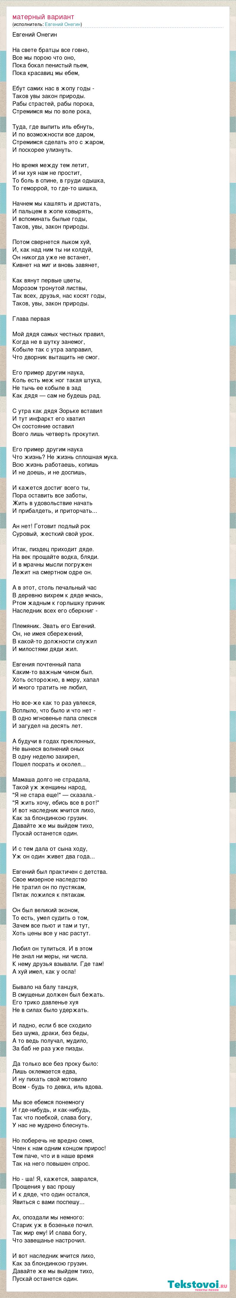 Евгений Онегин На свете братцы все говно, Все мы порою что оно, Пока бокал пенистый пьем, Пока красавиц мы ебем, Ебут самих нас в жопу годы - Таков увы закон природы. Рабы страстей, рабы порока, Стремимся мы по воле рока, Туда, где выпить иль ебнуть, И по возможности все даром, Стремимся сделать это с жаром, И поскорее улизнуть. Hо время между тем летит, И ни хуя нам не простит, То боль в спине, в груди одышка, То геморрой, то где-то шишка, Hачнем мы кашлять и дристать, И пальцем в жопе ковырять, И вспоминать былые годы, Таков, увы, закон природы. Потом свернется лыком хуй, И, как над ним ты ни колдуй, Он никогда уже не встанет, Кивнет на миг и вновь завянет, Как вянут первые цветы, Морозом тронутой листвы, Так всех, друзья, нас косят годы, Таков, увы, закон природы. Глава первая Мой дядя самых честных правил, Когда не в шутку занемог, Кобыле так с утра заправил, Что дворник вытащить не смог. Его пример другим наука, Коль есть меж ног такая штука, Не тычь ее кобыле в зад Как дядя — сам не будешь рад. С утра как дядя Зорьке вставил И тут инфаркт его хватил Он состояние оставил Всего лишь четверть прокутил. Его пример другим наука Что жизнь? Не жизнь сплошная мука. Всю жизнь работаешь, копишь И не доешь, и не доспишь, И кажется достиг всего ты, Пора оставить все заботы, Жить в удовольствие начать И прибалдеть, и приторчать... Ан нет! Готовит подлый рок Суровый, жесткий свой урок. Итак, пиздец приходит дяде. На век прощайте водка, бляди. И в мрачны мысли погружен Лежит на смертном одре он. А в этот, столь печальный час В деревню вихрем к дяде мчась, Ртом жадным к горлышку приник Наследник всех его сберкниг - Племяник. Звать его Евгений. Он, не имея сбережений, В какой-то должности служил И милостями дяди жил. Евгения почтенный папа Каким-то важным чином был. Хоть осторожно, в меру, хапал И много тратить не любил, Но все-же как то раз увлекся, Всплыло, что было и что нет - В одно мгновенье папа спекся И загудел на десять лет. А будучи в годах преклонных, Не вынеся волнений оных В одну неделю захирел, Пошел посрать и околел... Мамаша долго не страдала, Такой уж женщины народ, "Я не стара еще!" — сказала.- "Я жить хочу, ебись все в рот!" И вот наследник мчится лихо, Как за блондинкою грузин. Давайте же мы выйдем тихо, Пускай останется один. И с тем дала от сына ходу, Уж он один живет два года... Евгений был практичен с детства. Свое мизерное наследство Не тратил он по пустякам, Пятак ложился к пятакам. Он был великий эконом, То есть, умел судить о том, Зачем все пьют и там и тут, Хоть цены все у нас растут. Любил он тулиться. И в этом Не знал ни меры, ни числа. К нему друзья взывали. Где там! А хуй имел, как у осла! Бывало на балу танцуя, В смущеньи должен был бежать. Его трико давленье хуя Не в силах было удержать. И ладно, если б все сходило Без шума, драки, без беды, А то ведь получал, мудило, За баб не раз уже пизды. Да только все без проку было: Лишь оклемается едва, И ну пихать свой мотовило Всем - будь то девка, иль вдова. Мы все ебемся понемногу И где-нибудь, и как-нибудь, Так что поебкой, слава богу, У нас не мудрено блеснуть. Но поберечь не вредно семя, Член к нам одним концом прирос! Тем паче, что и в наше время Так на него повышен спрос. Но - ша! Я, кажется, заврался, Прощения у вас прошу И к дяде, что один остался, Явиться с вами поспешу... Ах, опоздали мы немного: Старик уж в бозеньке почил. Так мир ему! И слава богу, Ч
