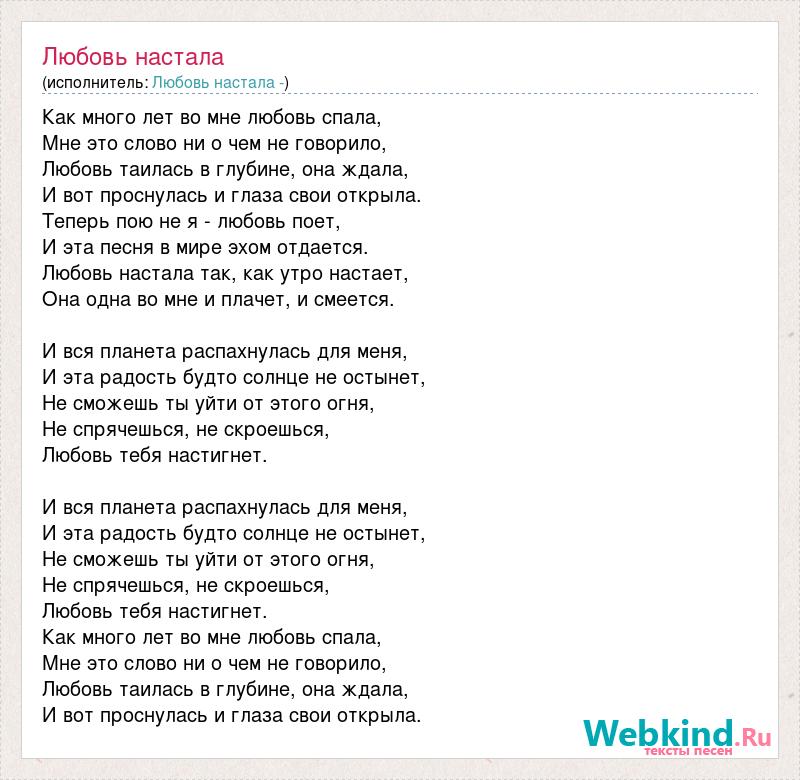 Как много лет во мне любовь спала, Мне это слово ни о чем не говорило, Любовь таилась в глубине, она ждала, И вот проснулась и глаза свои открыла. Теперь пою не я - любовь поет, И эта песня в мире эхом отдается. Любовь настала так, как утро настает, Она одна во мне и плачет, и смеется. И вся планета распахнулась для меня, И эта радость будто солнце не остынет, Не сможешь ты уйти от этого огня, Не спрячешься, не скроешься, Любовь тебя настигнет. И вся планета распахнулась для меня, И эта радость будто солнце не остынет, Не сможешь ты уйти от этого огня, Не спрячешься, не скроешься, Любовь тебя настигнет. Как много лет во мне любовь спала, Мне это слово ни о чем не говорило, Любовь таилась в глубине, она ждала, И вот проснулась и глаза свои открыла.