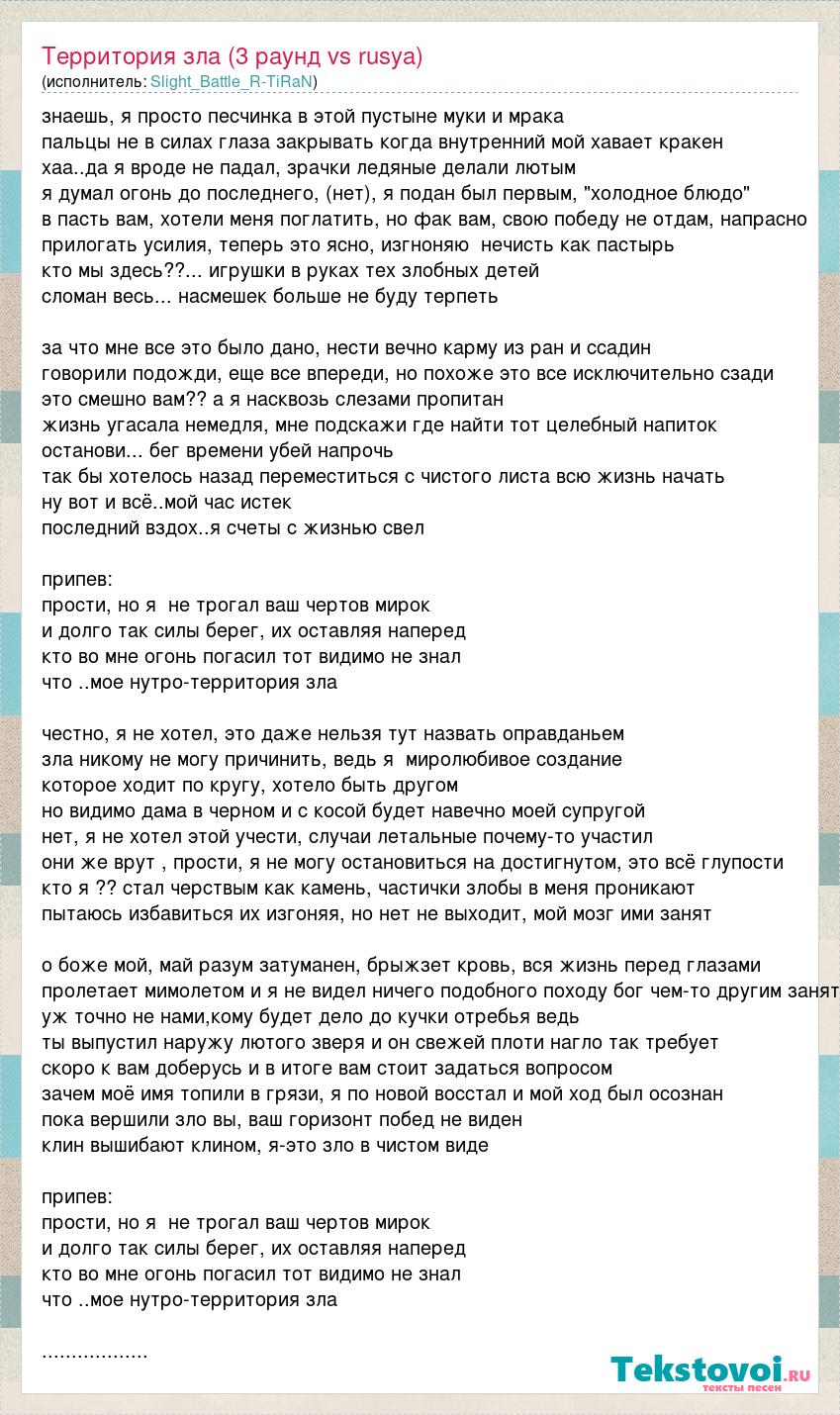знаешь, я просто песчинка в этой пустыне муки и мрака пальцы не в силах глаза закрывать когда внутренний мой хавает кракен хаа..да я вроде не падал, зрачки ледяные делали лютым я думал огонь до последнего, (нет), я подан был первым, "холодное блюдо" в пасть вам, хотели меня поглатить, но фак вам, свою победу не отдам, напрасно прилогать усилия, теперь это ясно, изгноняю нечисть как пастырь кто мы здесь??... игрушки в руках тех злобных детей сломан весь... насмешек больше не буду терпеть за что мне все это было дано, нести вечно карму из ран и ссадин говорили подожди, еще все впереди, но похоже это все исключительно сзади это смешно вам?? а я насквозь слезами пропитан жизнь угасала немедля, мне подскажи где найти тот целебный напиток останови... бег времени убей напрочь так бы хотелось назад переместиться с чистого листа всю жизнь начать ну вот и всё..мой час истек последний вздох..я счеты с жизнью свел припев: прости, но я не трогал ваш чертов мирок и долго так силы берег, их оставляя наперед кто во мне огонь погасил тот видимо не знал что ..мое нутро-территория зла честно, я не хотел, это даже нельзя тут назвать оправданьем зла никому не могу причинить, ведь я миролюбивое создание которое ходит по кругу, хотело быть другом но видимо дама в черном и с косой будет навечно моей супругой нет, я не хотел этой учести, случаи летальные почему-то участил они же врут , прости, я не могу остановиться на достигнутом, это всё глупости кто я ?? стал черствым как камень, частички злобы в меня проникают пытаюсь избавиться их изгоняя, но нет не выходит, мой мозг ими занят о боже мой, май разум затуманен, брыжзет кровь, вся жизнь перед глазами пролетает мимолетом и я не видел ничего подобного походу бог чем-то другим занят уж точно не нами,кому будет дело до кучки отребья ведь ты выпустил наружу лютого зверя и он свежей плоти нагло так требует скоро к вам доберусь и в итоге вам стоит задаться вопросом зачем моё имя топили в грязи, я по новой восстал и мой ход был осознан пока вершили зло вы, ваш горизонт побед не виден клин вышибают клином, я-это зло в чистом виде припев: прости, но я не трогал ваш чертов мирок и долго так силы берег, их оставляя наперед кто во мне огонь погасил тот видимо не знал что ..мое нутро-территория зла ..................