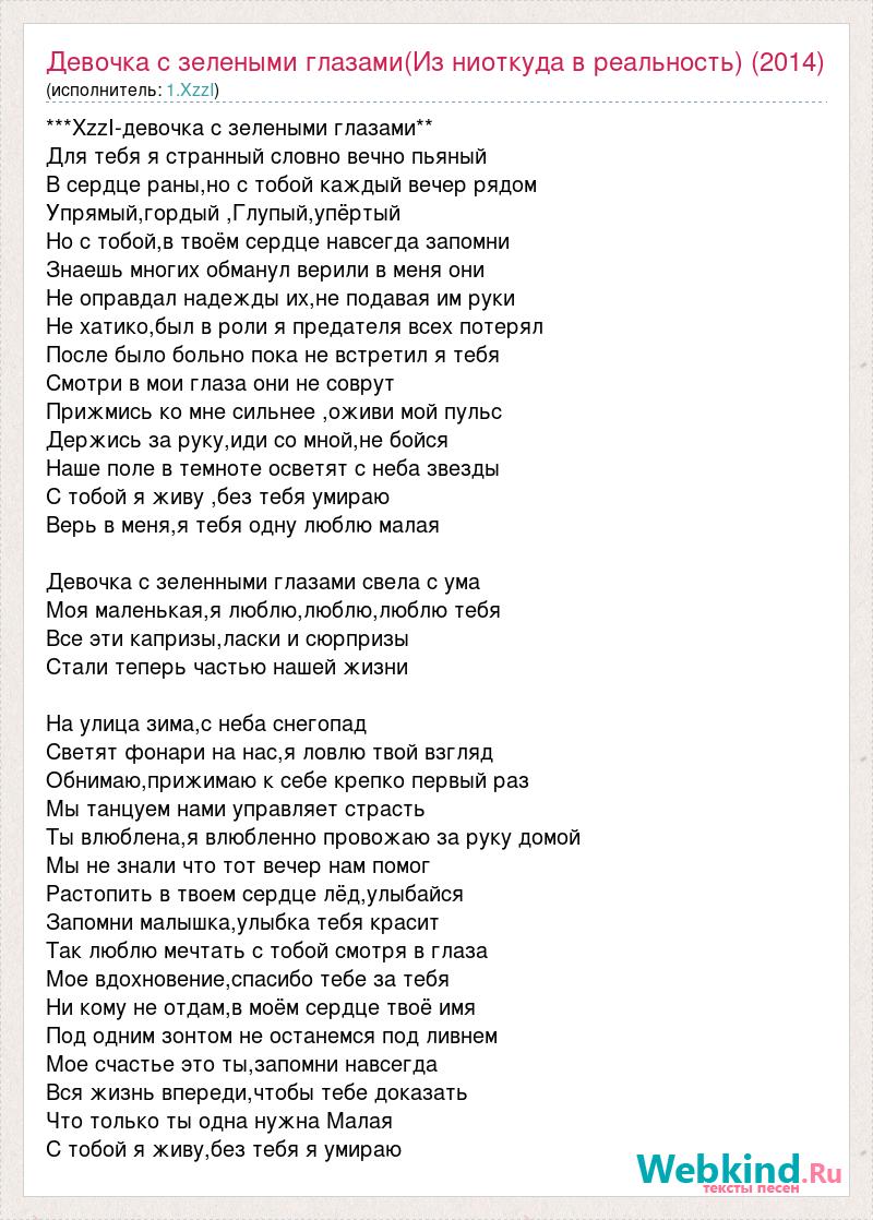 ***XzzI-девочка с зелеными глазами** Для тебя я странный словно вечно пьяный В сердце раны,но с тобой каждый вечер рядом Упрямый,гордый ,Глупый,упёртый Но с тобой,в твоём сердце навсегда запомни Знаешь многих обманул верили в меня они Не оправдал надежды их,не подавая им руки Не хатико,был в роли я предателя всех потерял После было больно пока не встретил я тебя Смотри в мои глаза они не соврут Прижмись ко мне сильнее ,оживи мой пульс Держись за руку,иди со мной,не бойся Наше поле в темноте осветят с неба звезды С тобой я живу ,без тебя умираю Верь в меня,я тебя одну люблю малая Девочка с зеленными глазами свела с ума Моя маленькая,я люблю,люблю,люблю тебя Все эти капризы,ласки и сюрпризы Стали теперь частью нашей жизни На улица зима,с неба снегопад Светят фонари на нас,я ловлю твой взгляд Обнимаю,прижимаю к себе крепко первый раз Мы танцуем нами управляет страсть Ты влюблена,я влюбленно провожаю за руку домой Мы не знали что тот вечер нам помог Растопить в твоем сердце лёд,улыбайся Запомни малышка,улыбка тебя красит Так люблю мечтать с тобой смотря в глаза Мое вдохновение,спасибо тебе за тебя Ни кому не отдам,в моём сердце твоё имя Под одним зонтом не останемся под ливнем Мое счастье это ты,запомни навсегда Вся жизнь впереди,чтобы тебе доказать Что только ты одна нужна Малая С тобой я живу,без тебя я умираю