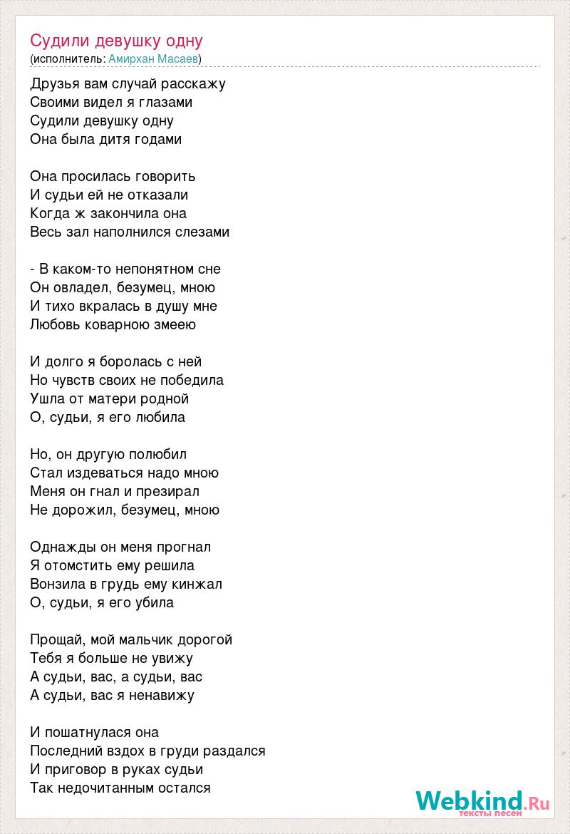 Друзья вам случай расскажу Своими видел я глазами Судили девушку одну Она была дитя годами Она просилась говорить И судьи ей не отказали Когда ж закончила она Весь зал наполнился слезами - В каком-то непонятном сне Он овладел, безумец, мною И тихо вкралась в душу мне Любовь коварною змеею И долго я боролась с ней Но чувств своих не победила Ушла от матери родной О, судьи, я его любила Но, он другую полюбил Стал издеваться надо мною Меня он гнал и презирал Не дорожил, безумец, мною Однажды он меня прогнал Я отомстить ему решила Вонзила в грудь ему кинжал О, судьи, я его убила Прощай, мой мальчик дорогой Тебя я больше не увижу А судьи, вас, а судьи, вас А судьи, вас я ненавижу И пошатнулася она Последний вздох в груди раздался И приговор в руках судьи Так недочитанным остался