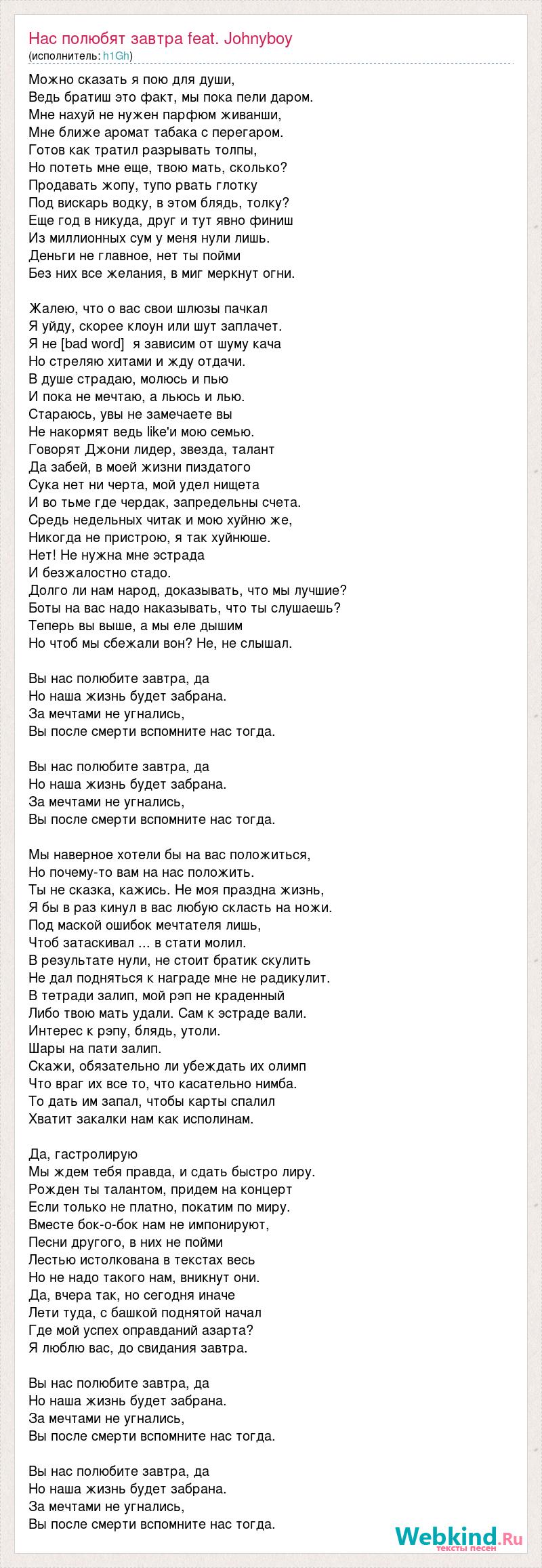 Можно сказать я пою для души, Ведь братиш это факт, мы пока пели даром. Мне нахуй не нужен парфюм живанши, Мне ближе аромат табака с перегаром. Готов как тратил разрывать толпы, Но потеть мне еще, твою мать, сколько? Продавать жопу, тупо рвать глотку Под вискарь водку, в этом блядь, толку? Еще год в никуда, друг и тут явно финиш Из миллионных сум у меня нули лишь. Деньги не главное, нет ты пойми Без них все желания, в миг меркнут огни. Жалею, что о вас свои шлюзы пачкал Я уйду, скорее клоун или шут заплачет. Я не [bad word] я зависим от шуму кача Но стреляю хитами и жду отдачи. В душе страдаю, молюсь и пью И пока не мечтаю, а льюсь и лью. Стараюсь, увы не замечаете вы Не накормят ведь like'и мою семью. Говорят Джони лидер, звезда, талант Да забей, в моей жизни пиздатого Сука нет ни черта, мой удел нищета И во тьме где чердак, запредельны счета. Средь недельных читак и мою хуйню же, Никогда не пристрою, я так хуйнюше. Нет! Не нужна мне эстрада И безжалостно стадо. Долго ли нам народ, доказывать, что мы лучшие? Боты на вас надо наказывать, что ты слушаешь? Теперь вы выше, а мы еле дышим Но чтоб мы сбежали вон? Не, не слышал. Вы нас полюбите завтра, да Но наша жизнь будет забрана. За мечтами не угнались, Вы после смерти вспомните нас тогда. Вы нас полюбите завтра, да Но наша жизнь будет забрана. За мечтами не угнались, Вы после смерти вспомните нас тогда. Мы наверное хотели бы на вас положиться, Но почему-то вам на нас положить. Ты не сказка, кажись. Не моя праздна жизнь, Я бы в раз кинул в вас любую скласть на ножи. Под маской ошибок мечтателя лишь, Чтоб затаскивал ... в стати молил. В результате нули, не стоит братик скулить Не дал подняться к награде мне не радикулит. В тетради залип, мой рэп не краденный Либо твою мать удали. Сам к эстраде вали. Интерес к рэпу, блядь, утоли. Шары на пати залип. Скажи, обязательно ли убеждать их олимп Что враг их все то, что касательно нимба. То дать им запал, чтобы карты спалил Хватит закалки нам как исполинам. Да, гастролирую Мы ждем тебя правда, и сдать быстро лиру. Рожден ты талантом, придем на концерт Если только не платно, покатим по миру. Вместе бок-о-бок нам не импонируют, Песни другого, в них не пойми Лестью истолкована в текстах весь Но не надо такого нам, вникнут они. Да, вчера так, но сегодня иначе Лети туда, с башкой поднятой начал Где мой успех оправданий азарта? Я люблю вас, до свидания завтра. Вы нас полюбите завтра, да Но наша жизнь будет забрана. За мечтами не угнались, Вы после смерти вспомните нас тогда. Вы нас полюбите завтра, да Но наша жизнь будет забрана. За мечтами не угнались, Вы после смерти вспомните нас тогда.