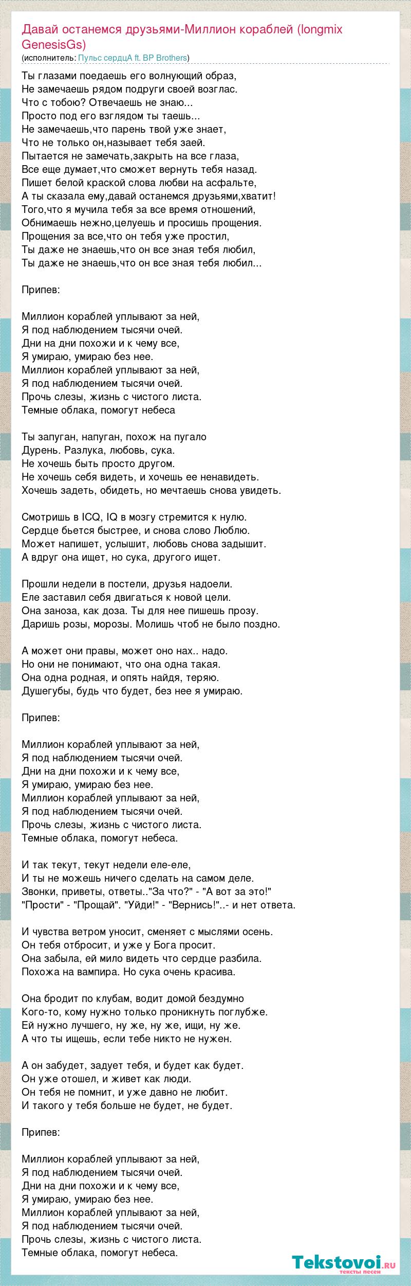 Главная→Исполнители→Пульс сердцА ft. BP Brothers→Давай останемся друзьями-Миллион кораблей (longmix GenesisGs)