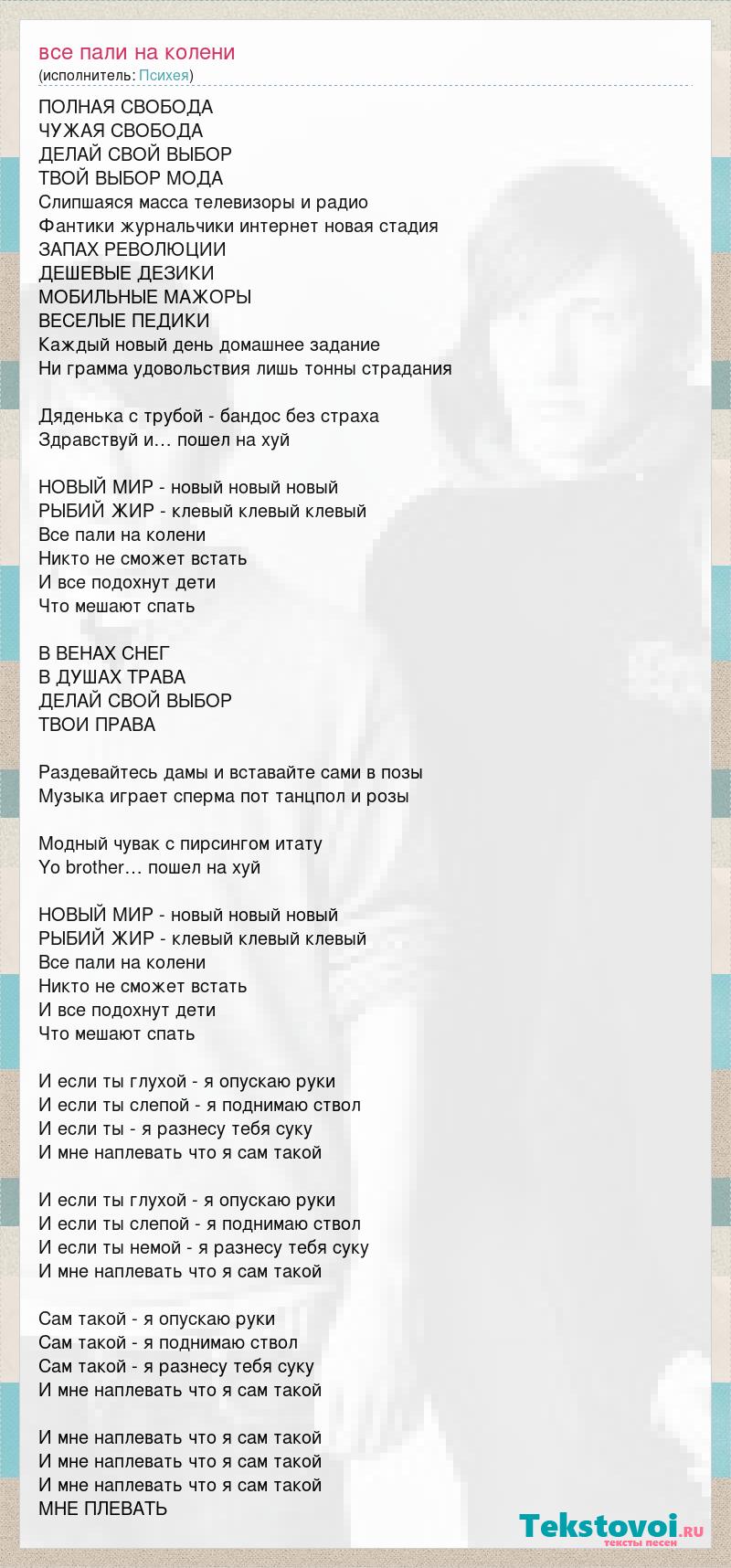 ПОЛНАЯ СВОБОДА ЧУЖАЯ СВОБОДА ДЕЛАЙ СВОЙ ВЫБОР ТВОЙ ВЫБОР МОДА Слипшаяся масса телевизоры и радио Фантики журнальчики интернет новая стадия ЗАПАХ РЕВОЛЮЦИИ ДЕШЕВЫЕ ДЕЗИКИ МОБИЛЬНЫЕ МАЖОРЫ ВЕСЕЛЫЕ ПЕДИКИ Каждый новый день домашнее задание Ни грамма удовольствия лишь тонны страдания Дяденька с трубой - бандос без страха Здравствуй и… пошел на хуй НОВЫЙ МИР - новый новый новый РЫБИЙ ЖИР - клевый клевый клевый Все пали на колени Никто не сможет встать И все подохнут дети Что мешают спать В ВЕНАХ СНЕГ В ДУШАХ ТРАВА ДЕЛАЙ СВОЙ ВЫБОР ТВОИ ПРАВА Раздевайтесь дамы и вставайте сами в позы Музыка играет сперма пот танцпол и розы Модный чувак с пирсингом итату Yo brother… пошел на хуй НОВЫЙ МИР - новый новый новый РЫБИЙ ЖИР - клевый клевый клевый Все пали на колени Никто не сможет встать И все подохнут дети Что мешают спать И если ты глухой - я опускаю руки И если ты слепой - я поднимаю ствол И если ты - я разнесу тебя суку И мне наплевать что я сам такой И если ты глухой - я опускаю руки И если ты слепой - я поднимаю ствол И если ты немой - я разнесу тебя суку И мне наплевать что я сам такой Сам такой - я опускаю руки Сам такой - я поднимаю ствол Сам такой - я разнесу тебя суку И мне наплевать что я сам такой И мне наплевать что я сам такой И мне наплевать что я сам такой И мне наплевать что я сам такой МНЕ ПЛЕВАТЬ
