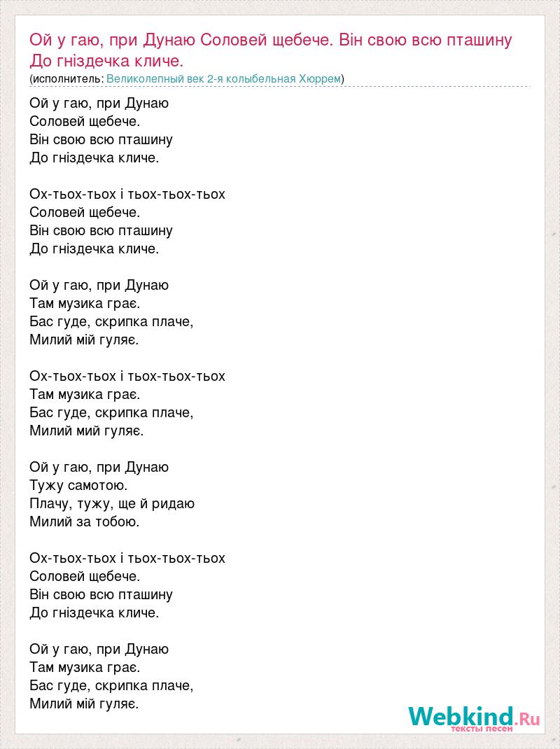 Ой у гаю, при Дунаю Соловей щебече. Він свою всю пташину До гніздечка кличе. Ох-тьох-тьох і тьох-тьох-тьох Соловей щебече. Він свою всю пташину До гніздечка кличе. Ой у гаю, при Дунаю Там музика грає. Бас гуде, скрипка плаче, Милий мій гуляє. Ох-тьох-тьох і тьох-тьох-тьох Там музика грає. Бас гуде, скрипка плаче, Милий мий гуляє. Ой у гаю, при Дунаю Тужу самотою. Плачу, тужу, ще й ридаю Милий за тобою. Ох-тьох-тьох і тьох-тьох-тьох Соловей щебече. Він свою всю пташину До гніздечка кличе. Ой у гаю, при Дунаю Там музика грає. Бас гуде, скрипка плаче, Милий мій гуляє.