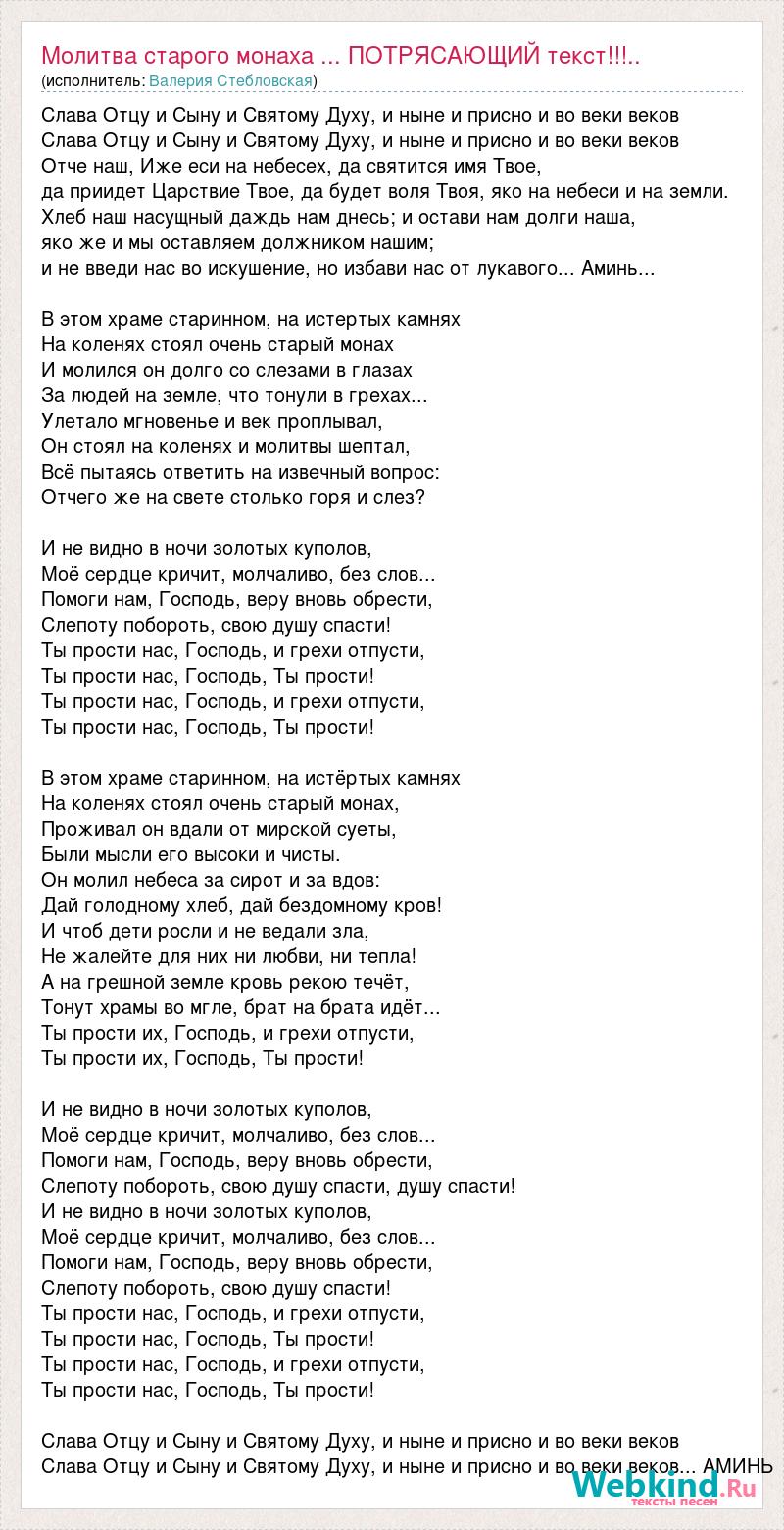 Слава Отцу и Сыну и Святому Духу, и ныне и присно и во веки веков Слава Отцу и Сыну и Святому Духу, и ныне и присно и во веки веков Отче наш, Иже еси на небесех, да святится имя Твое, да приидет Царствие Твое, да будет воля Твоя, яко на небеси и на земли. Хлеб наш насущный даждь нам днесь; и остави нам долги наша, яко же и мы оставляем должником нашим; и не введи нас во искушение, но избави нас от лукавого... Аминь... В этом храме старинном, на истертых камнях На коленях стоял очень старый монах И молился он долго со слезами в глазах За людей на земле, что тонули в грехах... Улетало мгновенье и век проплывал, Он стоял на коленях и молитвы шептал, Всё пытаясь ответить на извечный вопрос: Отчего же на свете столько горя и слез? И не видно в ночи золотых куполов, Моё сердце кричит, молчаливо, без слов... Помоги нам, Господь, веру вновь обрести, Слепоту побороть, свою душу спасти! Ты прости нас, Господь, и грехи отпусти, Ты прости нас, Господь, Ты прости! Ты прости нас, Господь, и грехи отпусти, Ты прости нас, Господь, Ты прости! В этом храме старинном, на истёртых камнях На коленях стоял очень старый монах, Проживал он вдали от мирской суеты, Были мысли его высоки и чисты. Он молил небеса за сирот и за вдов: Дай голодному хлеб, дай бездомному кров! И чтоб дети росли и не ведали зла, Не жалейте для них ни любви, ни тепла! А на грешной земле кровь рекою течёт, Тонут храмы во мгле, брат на брата идёт... Ты прости их, Господь, и грехи отпусти, Ты прости их, Господь, Ты прости! И не видно в ночи золотых куполов, Моё сердце кричит, молчаливо, без слов... Помоги нам, Господь, веру вновь обрести, Слепоту побороть, свою душу спасти, душу спасти! И не видно в ночи золотых куполов, Моё сердце кричит, молчаливо, без слов... Помоги нам, Господь, веру вновь обрести, Слепоту побороть, свою душу спасти! Ты прости нас, Господь, и грехи отпусти, Ты прости нас, Господь, Ты прости! Ты прости нас, Господь, и грехи отпусти, Ты прости нас, Господь, Ты прости! Слава Отцу и Сыну и Святому Духу, и ныне и присно и во веки веков Слава Отцу и Сыну и Святому Духу, и ныне и присно и во веки веков... АМИНЬ