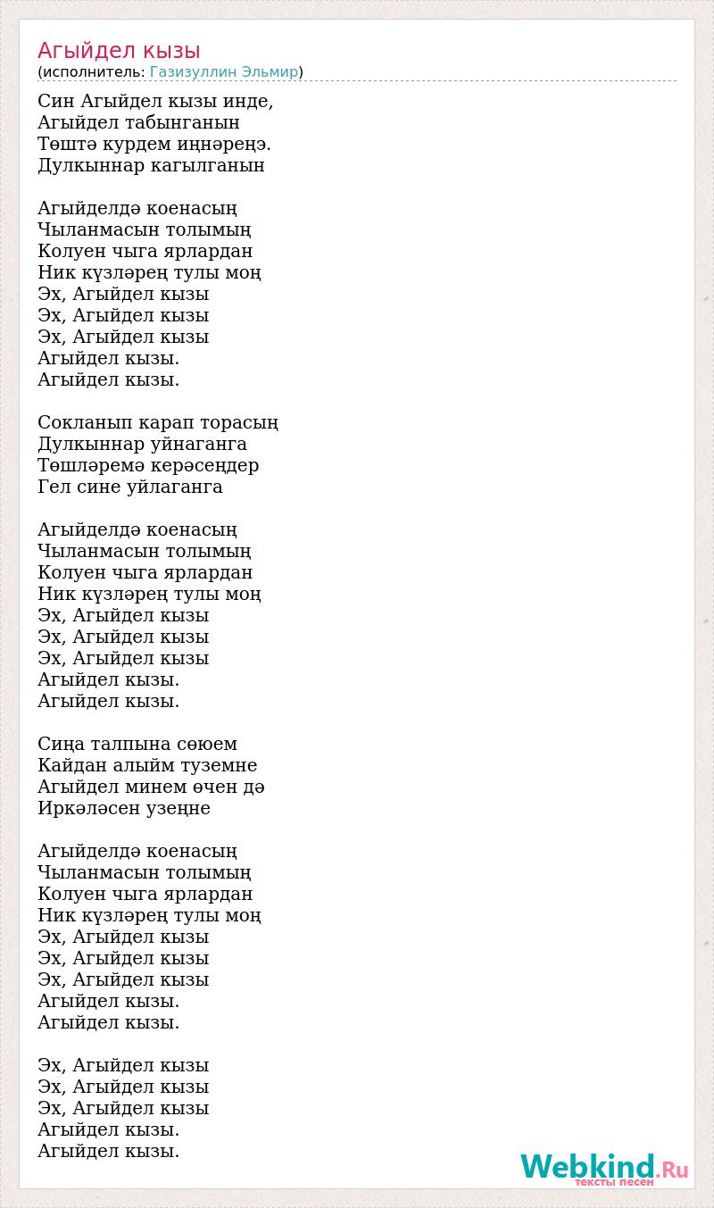 Син Агыйдел кызы инде, Агыйдел табынганын Төштә курдем иңнәреңэ. Дулкыннар кагылганын Агыйделдә коенасың Чыланмасын толымың Колуен чыга ярлардан Ник күзләрең тулы моң Эх, Агыйдел кызы Эх, Агыйдел кызы Эх, Агыйдел кызы Агыйдел кызы. Агыйдел кызы. Сокланып карап торасың Дулкыннар уйнаганга Төшләремә керәсеңдер Гел сине уйлаганга Агыйделдә коенасың Чыланмасын толымың Колуен чыга ярлардан Ник күзләрең тулы моң Эх, Агыйдел кызы Эх, Агыйдел кызы Эх, Агыйдел кызы Агыйдел кызы. Агыйдел кызы. Сиңа талпына сөюем Кайдан алыйм туземне Агыйдел минем өчен дә Иркәләсен узеңне Агыйделдә коенасың Чыланмасын толымың Колуен чыга ярлардан Ник күзләрең тулы моң Эх, Агыйдел кызы Эх, Агыйдел кызы Эх, Агыйдел кызы Агыйдел кызы. Агыйдел кызы. Эх, Агыйдел кызы Эх, Агыйдел кызы Эх, Агыйдел кызы Агыйдел кызы. Агыйдел кызы.