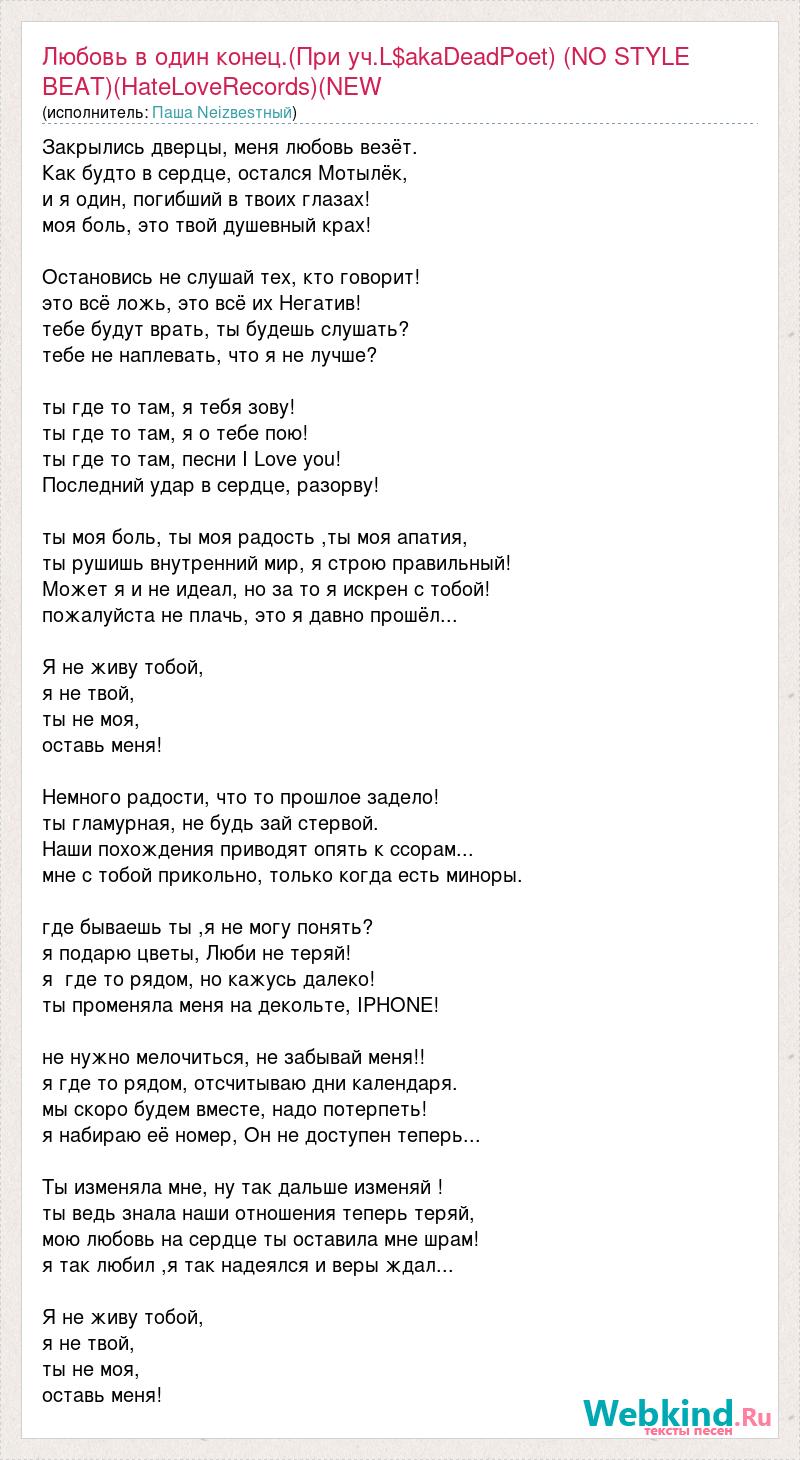 Закрылись дверцы, меня любовь везёт. Как будто в сердце, остался Мотылёк, и я один, погибший в твоих глазах! моя боль, это твой душевный крах! Остановись не слушай тех, кто говорит! это всё ложь, это всё их Негатив! тебе будут врать, ты будешь слушать? тебе не наплевать, что я не лучше? ты где то там, я тебя зову! ты где то там, я о тебе пою! ты где то там, песни I Love you! Последний удар в сердце, разорву! ты моя боль, ты моя радость ,ты моя апатия, ты рушишь внутренний мир, я строю правильный! Может я и не идеал, но за то я искрен с тобой! пожалуйста не плачь, это я давно прошёл... Я не живу тобой, я не твой, ты не моя, оставь меня! Немного радости, что то прошлое задело! ты гламурная, не будь зай стервой. Наши похождения приводят опять к ссорам... мне с тобой прикольно, только когда есть миноры. где бываешь ты ,я не могу понять? я подарю цветы, Люби не теряй! я где то рядом, но кажусь далеко! ты променяла меня на декольте, IPHONE! не нужно мелочиться, не забывай меня!! я где то рядом, отсчитываю дни календаря. мы скоро будем вместе, надо потерпеть! я набираю её номер, Он не доступен теперь... Ты изменяла мне, ну так дальше изменяй ! ты ведь знала наши отношения теперь теряй, мою любовь на сердце ты оставила мне шрам! я так любил ,я так надеялся и веры ждал... Я не живу тобой, я не твой, ты не моя, оставь меня!