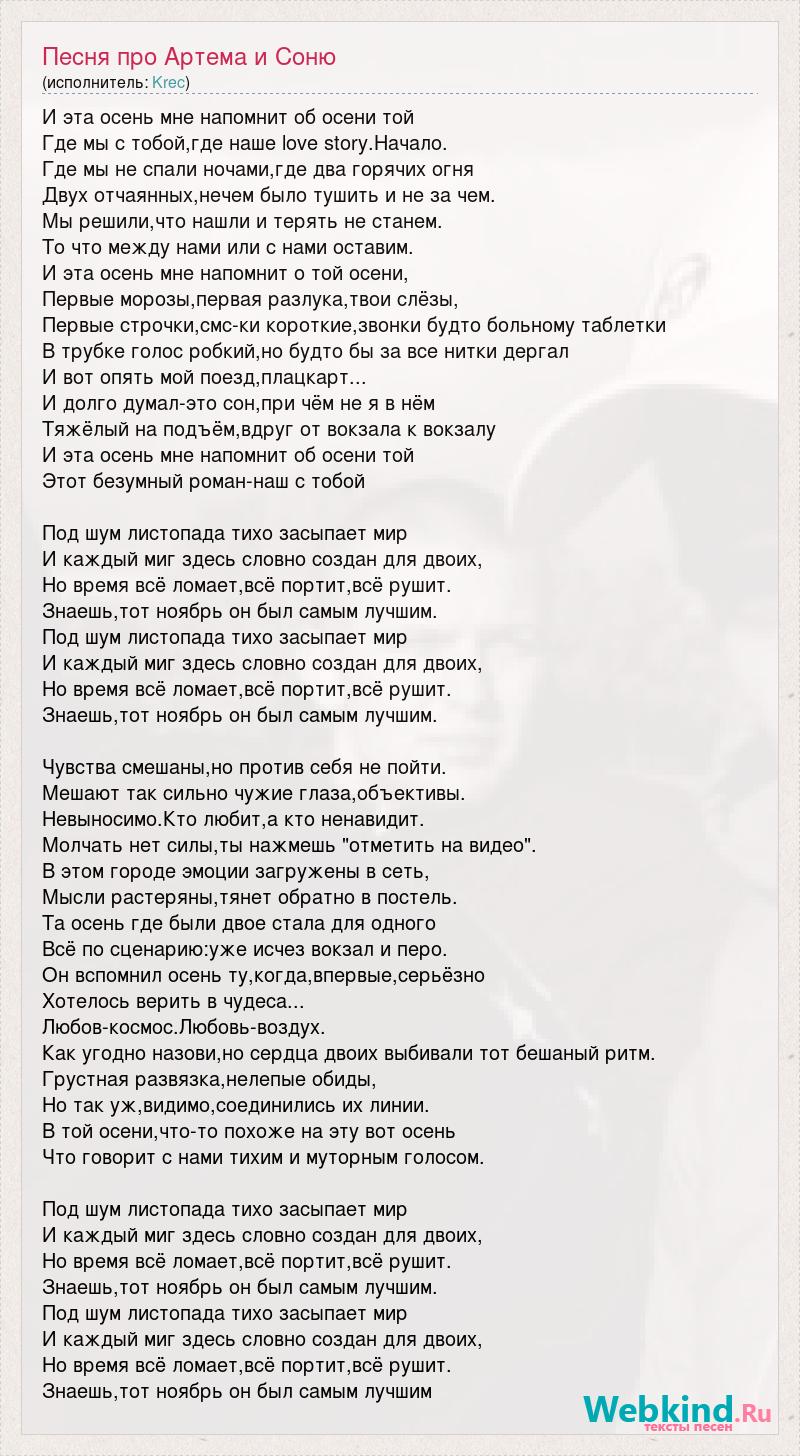 И эта осень мне напомнит об осени той Где мы с тобой,где наше love story.Начало. Где мы не спали ночами,где два горячих огня Двух отчаянных,нечем было тушить и не за чем. Мы решили,что нашли и терять не станем. То что между нами или с нами оставим. И эта осень мне напомнит о той осени, Первые морозы,первая разлука,твои слёзы, Первые строчки,смс-ки короткие,звонки будто больному таблетки В трубке голос робкий,но будто бы за все нитки дергал И вот опять мой поезд,плацкарт... И долго думал-это сон,при чём не я в нём Тяжёлый на подъём,вдруг от вокзала к вокзалу И эта осень мне напомнит об осени той Этот безумный роман-наш с тобой Под шум листопада тихо засыпает мир И каждый миг здесь словно создан для двоих, Но время всё ломает,всё портит,всё рушит. Знаешь,тот ноябрь он был самым лучшим. Под шум листопада тихо засыпает мир И каждый миг здесь словно создан для двоих, Но время всё ломает,всё портит,всё рушит. Знаешь,тот ноябрь он был самым лучшим. Чувства смешаны,но против себя не пойти. Мешают так сильно чужие глаза,объективы. Невыносимо.Кто любит,а кто ненавидит. Молчать нет силы,ты нажмешь "отметить на видео". В этом городе эмоции загружены в сеть, Мысли растеряны,тянет обратно в постель. Та осень где были двое стала для одного Всё по сценарию:уже исчез вокзал и перо. Он вспомнил осень ту,когда,впервые,серьёзно Хотелось верить в чудеса... Любов-космос.Любовь-воздух. Как угодно назови,но сердца двоих выбивали тот бешаный ритм. Грустная развязка,нелепые обиды, Но так уж,видимо,соединились их линии. В той осени,что-то похоже на эту вот осень Что говорит с нами тихим и муторным голосом. Под шум листопада тихо засыпает мир И каждый миг здесь словно создан для двоих, Но время всё ломает,всё портит,всё рушит. Знаешь,тот ноябрь он был самым лучшим. Под шум листопада тихо засыпает мир И каждый миг здесь словно создан для двоих, Но время всё ломает,всё портит,всё рушит. Знаешь,тот ноябрь он был самым лучшим