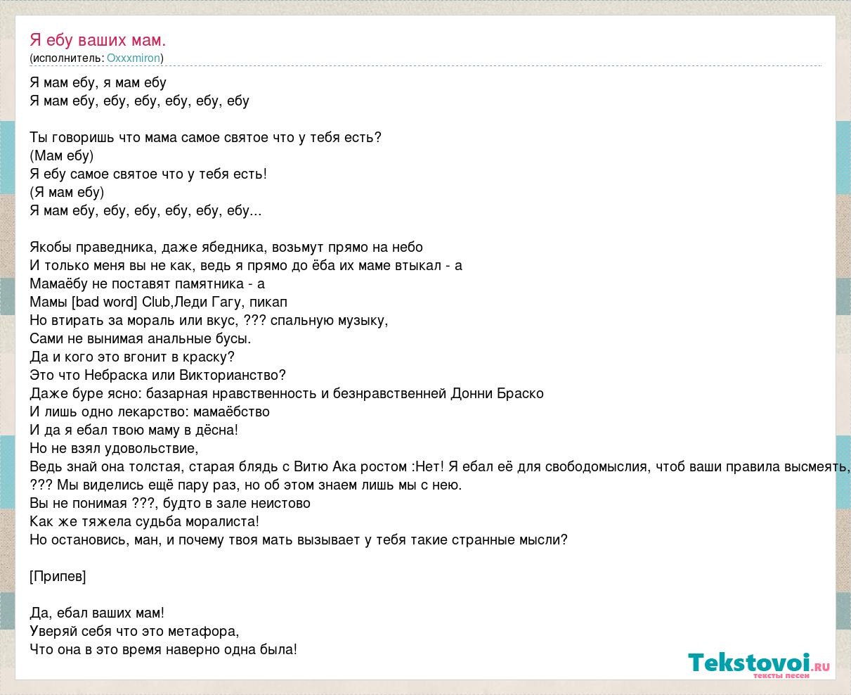 Я мам ебу, я мам ебу Я мам ебу, ебу, ебу, ебу, ебу, ебу Ты говоришь что мама самое святое что у тебя есть? (Мам ебу) Я ебу самое святое что у тебя есть! (Я мам ебу) Я мам ебу, ебу, ебу, ебу, ебу, ебу... Якобы праведника, даже ябедника, возьмут прямо на небо И только меня вы не как, ведь я прямо до ёба их маме втыкал - а Мамаёбу не поставят памятника - а Мамы любят Comedy Club,Леди Гагу, пикап Но втирать за мораль или вкус, ??? спальную музыку, Сами не вынимая анальные бусы. Да и кого это вгонит в краску? Это что Небраска или Викторианство? Даже буре ясно: базарная нравственность и безнравственней Донни Браско И лишь одно лекарство: мамаёбство И да я ебал твою маму в дёсна! Но не взял удовольствие, Ведь знай она толстая, старая блядь с Витю Ака ростом :Нет! Я ебал её для свободомыслия, чтоб ваши правила высмеять, ??? Мы виделись ещё пару раз, но об этом знаем лишь мы с нею. Вы не понимая ???, будто в зале неистово Как же тяжела судьба моралиста! Но остановись, ман, и почему твоя мать вызывает у тебя такие странные мысли? [Припев] Да, ебал ваших мам! Уверяй себя что это метафора, Что она в это время наверно одна была!