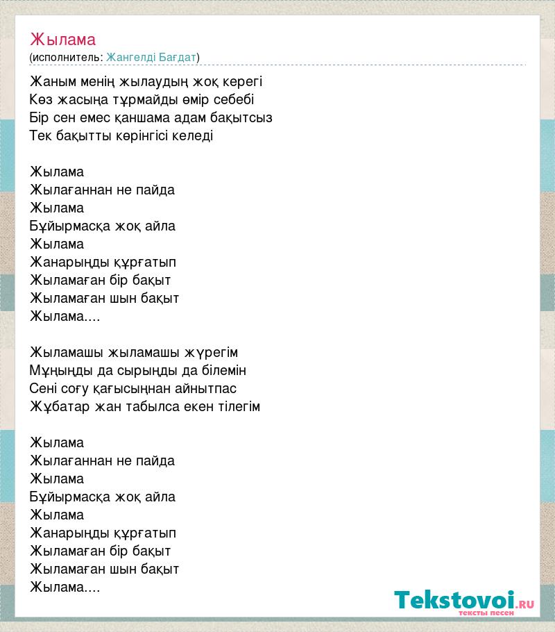 Жаным менің жылаудың жоқ керегі Көз жасыңа тұрмайды өмір себебі Бір сен емес қаншама адам бақытсыз Тек бақытты көрінгісі келеді Жылама Жылағаннан не пайда Жылама Бұйырмасқа жоқ айла Жылама Жанарыңды құрғатып Жыламаған бір бақыт Жыламаған шын бақыт Жылама.... Жыламашы жыламашы жүрегім Мұңыңды да сырыңды да білемін Сені соғу қағысыңнан айнытпас Жұбатар жан табылса екен тілегім Жылама Жылағаннан не пайда Жылама Бұйырмасқа жоқ айла Жылама Жанарыңды құрғатып Жыламаған бір бақыт Жыламаған шын бақыт Жылама....