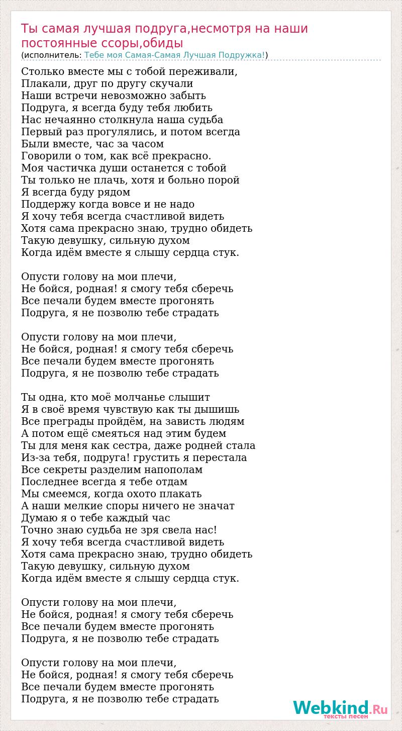 Столько вместе мы с тобой переживали, Плакали, друг по другу скучали Наши встречи невозможно забыть Подруга, я всегда буду тебя любить Нас нечаянно столкнула наша судьба Первый раз прогулялись, и потом всегда Были вместе, час за часом Говорили о том, как всё прекрасно. Моя частичка души останется с тобой Ты только не плачь, хотя и больно порой Я всегда буду рядом Поддержу когда вовсе и не надо Я хочу тебя всегда счастливой видеть Хотя сама прекрасно знаю, трудно обидеть Такую девушку, сильную духом Когда идём вместе я слышу сердца стук. Опусти голову на мои плечи, Не бойся, родная! я смогу тебя сберечь Все печали будем вместе прогонять Подруга, я не позволю тебе страдать Опусти голову на мои плечи, Не бойся, родная! я смогу тебя сберечь Все печали будем вместе прогонять Подруга, я не позволю тебе страдать Ты одна, кто моё молчанье слышит Я в своё время чувствую как ты дышишь Все преграды пройдём, на зависть людям А потом ещё смеяться над этим будем Ты для меня как сестра, даже родней стала Из-за тебя, подруга! грустить я перестала Все секреты разделим напополам Последнее всегда я тебе отдам Мы смеемся, когда охото плакать А наши мелкие споры ничего не значат Думаю я о тебе каждый час Точно знаю судьба не зря свела нас! Я хочу тебя всегда счастливой видеть Хотя сама прекрасно знаю, трудно обидеть Такую девушку, сильную духом Когда идём вместе я слышу сердца стук. Опусти голову на мои плечи, Не бойся, родная! я смогу тебя сберечь Все печали будем вместе прогонять Подруга, я не позволю тебе страдать Опусти голову на мои плечи, Не бойся, родная! я смогу тебя сберечь Все печали будем вместе прогонять Подруга, я не позволю тебе страдать