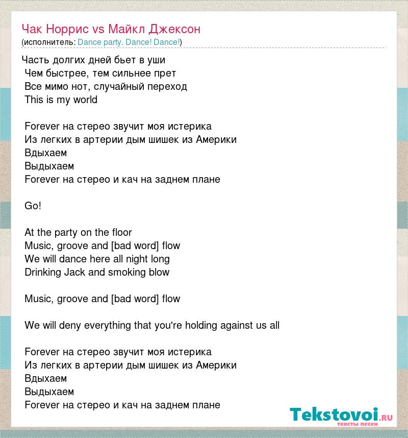 Часть долгих дней бьет в уши Чем быстрее, тем сильнее прет Все мимо нот, случайный переход This is my world Forever на стерео звучит моя истерика Из легких в артерии дым шишек из Америки Вдыхаем Выдыхаем Forever на стерео и кач на заднем плане Go! At the party on the floor Music, groove and [bad word] flow We will dance here all night long Drinking Jack and smoking blow Music, groove and [bad word] flow We will deny everything that you're holding against us all Forever на стерео звучит моя истерика Из легких в артерии дым шишек из Америки Вдыхаем Выдыхаем Forever на стерео и кач на заднем плане
