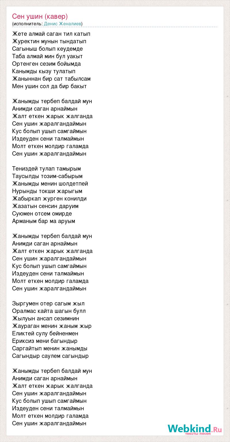 Жете алмай саган тил катып Журектин мунын тындатып Сагыныш болып кеудемде Таба алмай мин бул уакыт Ортенген сезим бойымда Канымды кызу тулатып Жаныннан бир сат табылсам Мен ушин сол да бир бакыт Жанымды тербеп балдай мун Анимди саган арнаймын Жалт еткен жарык жалганда Сен ушин жаралгандаймын Кус болып ушып самгаймын Издеуден сени талмаймын Молт еткен молдир галамда Сен ушин жаралгандаймын Тениздей тулап тамырым Таусылды тозим-сабырым Жанымды менин шолдетпей Нурынды токши жарыгым Жабыркап журген конилди Жазатын сенсин даруим Суюмен отсем омирде Арманым бар ма аруым Жанымды тербеп балдай мун Анимди саган арнаймын Жалт еткен жарык жалганда Сен ушин жаралгандаймын Кус болып ушып самгаймын Издеуден сени талмаймын Молт еткен молдир галамда Сен ушин жаралгандаймын Зыргумен отер сагым жыл Оралмас кайта шагын булл Жылуын ансап сезимнин Жаураган менин жаным жыр Еликтей сулу бейненмен Ериксиз мени багындыр Саргайтып менин жанымды Сагындыр саулем сагындыр Жанымды тербеп балдай мун Анимди саган арнаймын Жалт еткен жарык жалганда Сен ушин жаралгандаймын Кус болып ушып самгаймын Издеуден сени талмаймын Молт еткен молдир галамда Сен ушин жаралгандаймын