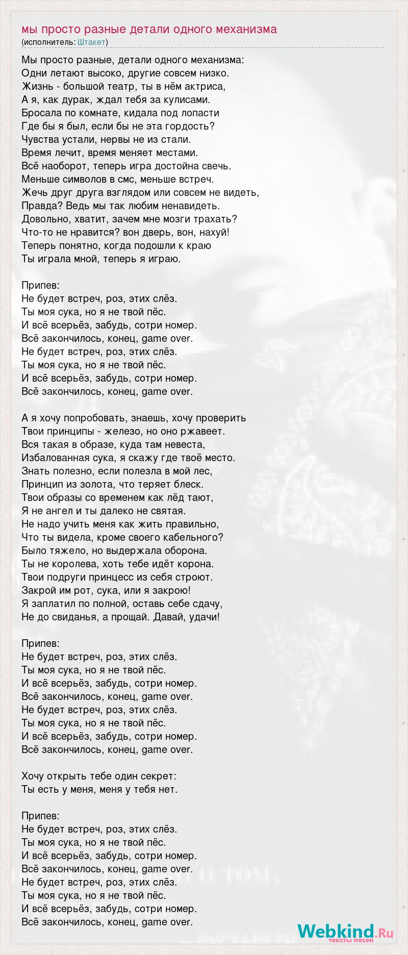 Мы просто разные, детали одного механизма: Одни летают высоко, другие совсем низко. Жизнь - большой театр, ты в нём актриса, А я, как дурак, ждал тебя за кулисами. Бросала по комнате, кидала под лопасти Где бы я был, если бы не эта гордость? Чувства устали, нервы не из стали. Время лечит, время меняет местами. Всё наоборот, теперь игра достойна свечь. Меньше символов в смс, меньше встреч. Жечь друг друга взглядом или совсем не видеть, Правда? Ведь мы так любим ненавидеть. Довольно, хватит, зачем мне мозги трахать? Что-то не нравится? вон дверь, вон, нахуй! Теперь понятно, когда подошли к краю Ты играла мной, теперь я играю. Припев: Не будет встреч, роз, этих слёз. Ты моя сука, но я не твой пёс. И всё всерьёз, забудь, сотри номер. Всё закончилось, конец, game over. Не будет встреч, роз, этих слёз. Ты моя сука, но я не твой пёс. И всё всерьёз, забудь, сотри номер. Всё закончилось, конец, game over. А я хочу попробовать, знаешь, хочу проверить Твои принципы - железо, но оно ржавеет. Вся такая в образе, куда там невеста, Избалованная сука, я скажу где твоё место. Знать полезно, если полезла в мой лес, Принцип из золота, что теряет блеск. Твои образы со временем как лёд тают, Я не ангел и ты далеко не святая. Не надо учить меня как жить правильно, Что ты видела, кроме своего кабельного? Было тяжело, но выдержала оборона. Ты не королева, хоть тебе идёт корона. Твои подруги принцесс из себя строют. Закрой им рот, сука, или я закрою! Я заплатил по полной, оставь себе сдачу, Не до свиданья, а прощай. Давай, удачи! Припев: Не будет встреч, роз, этих слёз. Ты моя сука, но я не твой пёс. И всё всерьёз, забудь, сотри номер. Всё закончилось, конец, game over. Не будет встреч, роз, этих слёз. Ты моя сука, но я не твой пёс. И всё всерьёз, забудь, сотри номер. Всё закончилось, конец, game over. Хочу открыть тебе один секрет: Ты есть у меня, меня у тебя нет. Припев: Не будет встреч, роз, этих слёз. Ты моя сука, но я не твой пёс. И всё всерьёз, забудь, сотри номер. Всё закончилось, конец, game over. Не будет встреч, роз, этих слёз. Ты моя сука, но я не твой пёс. И всё всерьёз, забудь, сотри номер. Всё закончилось, конец, game over.