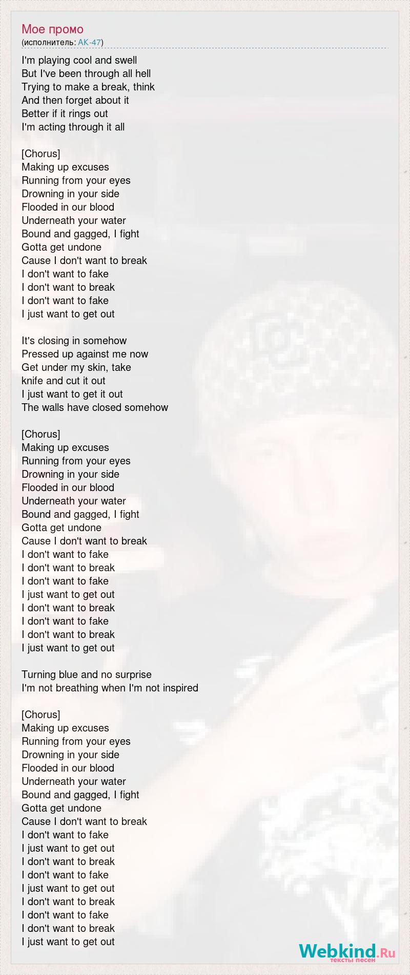 I'm playing cool and swell But I've been through all hell Trying to make a break, think And then forget about it Better if it rings out I'm acting through it all [Chorus] Making up excuses Running from your eyes Drowning in your side Flooded in our blood Underneath your water Bound and gagged, I fight Gotta get undone Cause I don't want to break I don't want to fake I don't want to break I don't want to fake I just want to get out It's closing in somehow Pressed up against me now Get under my skin, take knife and cut it out I just want to get it out The walls have closed somehow [Chorus] Making up excuses Running from your eyes Drowning in your side Flooded in our blood Underneath your water Bound and gagged, I fight Gotta get undone Cause I don't want to break I don't want to fake I don't want to break I don't want to fake I just want to get out I don't want to break I don't want to fake I don't want to break I just want to get out Turning blue and no surprise I'm not breathing when I'm not inspired [Chorus] Making up excuses Running from your eyes Drowning in your side Flooded in our blood Underneath your water Bound and gagged, I fight Gotta get undone Cause I don't want to break I don't want to fake I just want to get out I don't want to break I don't want to fake I just want to get out I don't want to break I don't want to fake I don't want to break I just want to get out