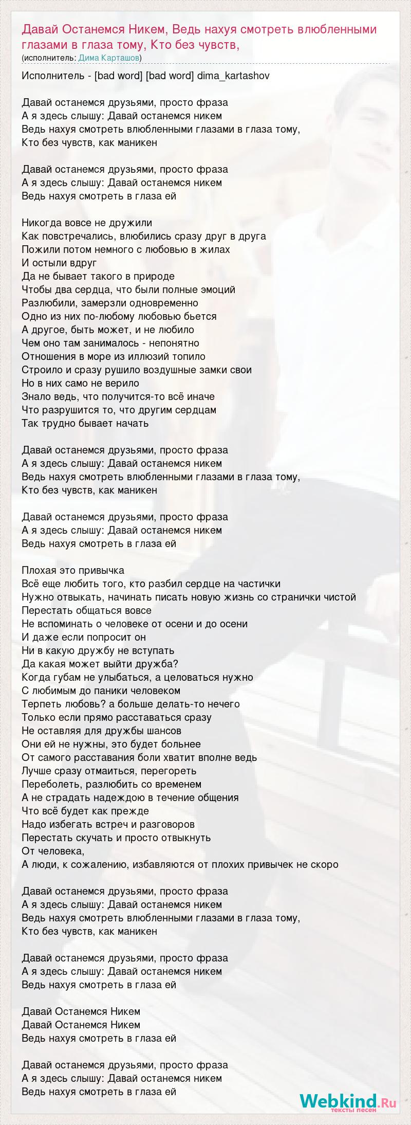 Исполнитель - [bad word] [bad word] dima_kartashov Давай останемся друзьями, просто фраза А я здесь слышу: Давай останемся никем Ведь нахуя смотреть влюбленными глазами в глаза тому, Кто без чувств, как маникен Давай останемся друзьями, просто фраза А я здесь слышу: Давай останемся никем Ведь нахуя смотреть в глаза ей Никогда вовсе не дружили Как повстречались, влюбились сразу друг в друга Пожили потом немного с любовью в жилах И остыли вдруг Да не бывает такого в природе Чтобы два сердца, что были полные эмоций Разлюбили, замерзли одновременно Одно из них по-любому любовью бьется А другое, быть может, и не любило Чем оно там занималось - непонятно Отношения в море из иллюзий топило Строило и сразу рушило воздушные замки свои Но в них само не верило Знало ведь, что получится-то всё иначе Что разрушится то, что другим сердцам Так трудно бывает начать Давай останемся друзьями, просто фраза А я здесь слышу: Давай останемся никем Ведь нахуя смотреть влюбленными глазами в глаза тому, Кто без чувств, как маникен Давай останемся друзьями, просто фраза А я здесь слышу: Давай останемся никем Ведь нахуя смотреть в глаза ей Плохая это привычка Всё еще любить того, кто разбил сердце на частички Нужно отвыкать, начинать писать новую жизнь со странички чистой Перестать общаться вовсе Не вспоминать о человеке от осени и до осени И даже если попросит он Ни в какую дружбу не вступать Да какая может выйти дружба? Когда губам не улыбаться, а целоваться нужно С любимым до паники человеком Терпеть любовь? а больше делать-то нечего Только если прямо расставаться сразу Не оставляя для дружбы шансов Они ей не нужны, это будет больнее От самого расставания боли хватит вполне ведь Лучше сразу отмаиться, перегореть Переболеть, разлюбить со временем А не страдать надеждою в течение общения Что всё будет как прежде Надо избегать встреч и разговоров Перестать скучать и просто отвыкнуть От человека, А люди, к сожалению, избавляются от плохих привычек не скоро Давай останемся друзьями, просто фраза А я здесь слышу: Давай останемся никем Ведь нахуя смотреть влюбленными глазами в глаза тому, Кто без чувств, как маникен Давай останемся друзьями, просто фраза А я здесь слышу: Давай останемся никем Ведь нахуя смотреть в глаза ей Давай Останемся Никем Давай Останемся Никем Ведь нахуя смотреть в глаза ей Давай останемся друзьями, просто фраза А я здесь слышу: Давай останемся никем Ведь нахуя смотреть в глаза ей