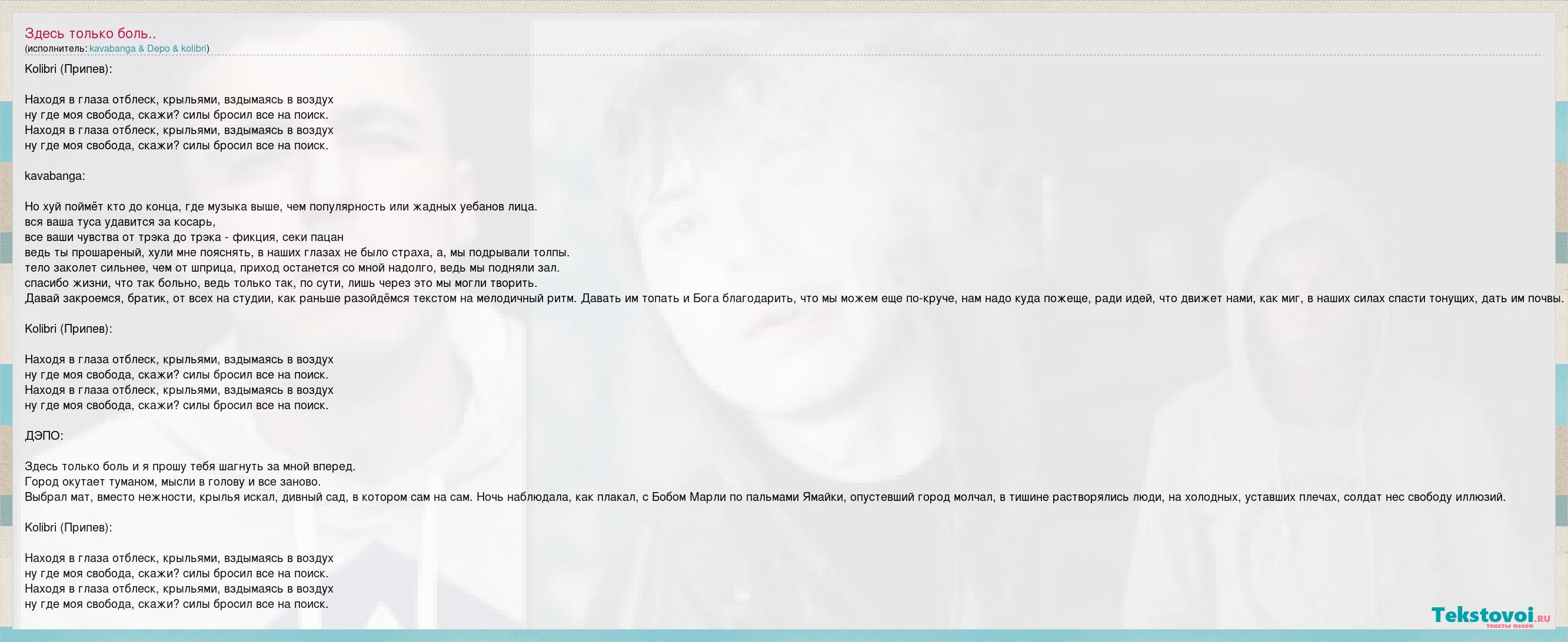 Kolibri (Припев): Находя в глаза отблеск, крыльями, вздымаясь в воздух ну где моя свобода, скажи? силы бросил все на поиск. Находя в глаза отблеск, крыльями, вздымаясь в воздух ну где моя свобода, скажи? силы бросил все на поиск. kavabanga: Но хуй поймёт кто до конца, где музыка выше, чем популярность или жадных уебанов лица. вся ваша туса удавится за косарь, все ваши чувства от трэка до трэка - фикция, секи пацан ведь ты прошареный, хули мне пояснять, в наших глазах не было страха, а, мы подрывали толпы. тело заколет сильнее, чем от шприца, приход останется со мной надолго, ведь мы подняли зал. спасибо жизни, что так больно, ведь только так, по сути, лишь через это мы могли творить. Давай закроемся, братик, от всех на студии, как раньше разойдёмся текстом на мелодичный ритм. Давать им топать и Бога благодарить, что мы можем еще по-круче, нам надо куда пожеще, ради идей, что движет нами, как миг, в наших силах спасти тонущих, дать им почвы. Kolibri (Припев): Находя в глаза отблеск, крыльями, вздымаясь в воздух ну где моя свобода, скажи? силы бросил все на поиск. Находя в глаза отблеск, крыльями, вздымаясь в воздух ну где моя свобода, скажи? силы бросил все на поиск. ДЭПО: Здесь только боль и я прошу тебя шагнуть за мной вперед. Город окутает туманом, мысли в голову и все заново. Выбрал мат, вместо нежности, крылья искал, дивный сад, в котором сам на сам. Ночь наблюдала, как плакал, с Бобом Марли по пальмами Ямайки, опустевший город молчал, в тишине растворялись люди, на холодных, уставших плечах, солдат нес свободу иллюзий. Kolibri (Припев): Находя в глаза отблеск, крыльями, вздымаясь в воздух ну где моя свобода, скажи? силы бросил все на поиск. Находя в глаза отблеск, крыльями, вздымаясь в воздух ну где моя свобода, скажи? силы бросил все на поиск.