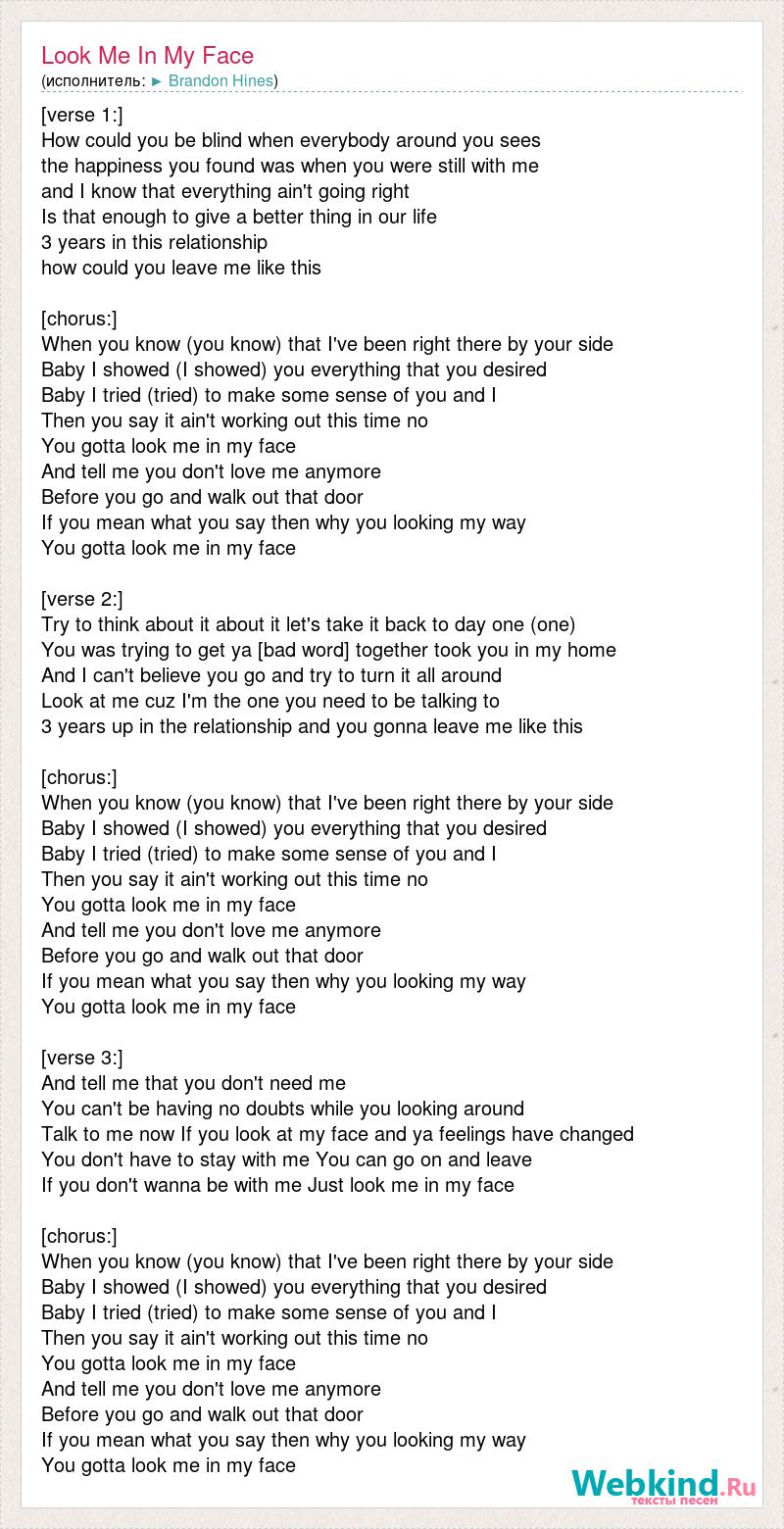 [verse 1:] How could you be blind when everybody around you sees the happiness you found was when you were still with me and I know that everything ain't going right Is that enough to give a better thing in our life 3 years in this relationship how could you leave me like this [chorus:] When you know (you know) that I've been right there by your side Baby I showed (I showed) you everything that you desired Baby I tried (tried) to make some sense of you and I Then you say it ain't working out this time no You gotta look me in my face And tell me you don't love me anymore Before you go and walk out that door If you mean what you say then why you looking my way You gotta look me in my face [verse 2:] Try to think about it about it let's take it back to day one (one) You was trying to get ya [bad word] together took you in my home And I can't believe you go and try to turn it all around Look at me cuz I'm the one you need to be talking to 3 years up in the relationship and you gonna leave me like this [chorus:] When you know (you know) that I've been right there by your side Baby I showed (I showed) you everything that you desired Baby I tried (tried) to make some sense of you and I Then you say it ain't working out this time no You gotta look me in my face And tell me you don't love me anymore Before you go and walk out that door If you mean what you say then why you looking my way You gotta look me in my face [verse 3:] And tell me that you don't need me You can't be having no doubts while you looking around Talk to me now If you look at my face and ya feelings have changed You don't have to stay with me You can go on and leave If you don't wanna be with me Just look me in my face [chorus:] When you know (you know) that I've been right there by your side Baby I showed (I showed) you everything that you desired Baby I tried (tried) to make some sense of you and I Then you say it ain't working out this time no You gotta look me in my face And tell me you don't love me anymore Before you go and walk out that door If you mean what you say then why you looking my way You gotta look me in my face