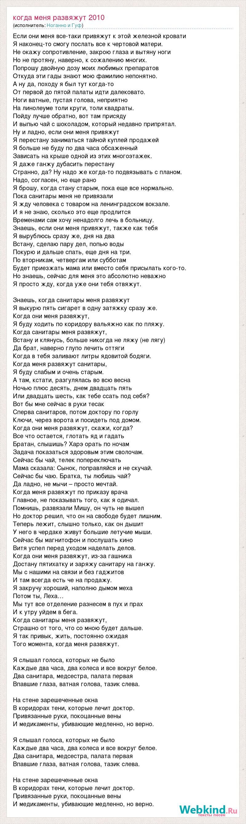 Если они меня все-таки привяжут к этой железной кровати Я наконец-то смогу послать все к чертовой матери. Не окажу сопротивление, закрою глаза и вытяну ноги Но не протяну, наверно, к сожалению многих. Попрошу двойную дозу моих любимых препаратов Откуда эти гады знают мою фамилию непонятно. А ну да, походу я был тут когда-то От первой до пятой палаты идти далековато. Ноги ватные, пустая голова, неприятно На линолеуме толи круги, толи квадраты. Пойду лучше обратно, вот там присяду И выпью чай с шоколадом, который недавно припрятал. Ну и ладно, если они меня привяжут Я перестану заниматься тайной куплей продажей Я больше не буду по два часа обсаженный Зависать на крыше одной из этих многоэтажек. Я даже ганжу дубасить перестану Странно, да? Ну надо же когда-то подвязывать с планом. Надо, согласен, но еще рано Я брошу, когда стану старым, пока еще все нормально. Пока санитары меня не привязали Я жду человека с товаром на ленинградском вокзале. И я не знаю, сколько это еще продлится Временами сам хочу ненадолго лечь в больницу. Знаешь, если они меня привяжут, также как тебя Я вырублюсь сразу же, дня на два Встану, сделаю пару дел, попью воды Покурю и дальше спать, еще дня на три. По вторникам, четвергам или субботам Будет приезжать мама или вместо себя присылать кого-то. Но знаешь, сейчас для меня это абсолютно неважно Я просто жду, когда уже они тебя отвяжут. Знаешь, когда санитары меня развяжут Я выкурю пять сигарет в одну затяжку сразу же. Когда они меня развяжут, Я буду ходить по коридору вальяжно как по пляжу. Когда санитары меня развяжут, Встану и клянусь, больше никогда не ляжу (не лягу) Да брат, наверно глупо лечить оттяги Когда в тебя заливают литры ядовитой бодяги. Когда меня развяжут санитары, Я буду слабым и очень старым. А там, кстати, разгулялась во всю весна Ночью плюс десять, днем двадцать пять Или двадцать шесть, как тебе ссать под себя? Вот бы мне сейчас в руки тесак Сперва санитаров, потом доктору по горлу Ключи, через ворота и посидеть под домом. Когда они меня развяжут, скажи, когда? Все что остается, глотать яд и гадать Братан, слышишь? Харэ орать по ночам Задача показаться здоровым этим сволочам. Сейчас бы чай, телек попереключать Мама сказала: Сынок, поправляйся и не скучай. Сейчас бы чаю. Братка, ты любишь чай? Да ладно, не мычи – просто мечтай. Когда меня развяжут по приказу врача Главное, не показывать того, как я одичал. Помнишь, развязали Мишу, он чуть не вышел Но доктор решил, что он на свободе будет лишним. Теперь лежит, слышно только, как он дышит У него в чердаке живут большие летучие мыши. Сейчас бы магнитофон и послушать кино Витя успел перед уходом наделать делов. Когда они меня развяжут, из-за гашника Достану пятихатку и заряжу санитару на ганжу. Мы с нашими на связи и без гаджитов И там всегда есть че на продажу. Я закручу хороший, наполню дымом меха Потом ты, Леха… Мы тут все отделение разнесем в пух и прах И к утру уйдем в бега. Когда санитары меня развяжут, Страшно от того, что со мною будет дальше. Я так привык, жить, постоянно ожидая Того момента, когда меня развяжут. Я слышал голоса, которых не было Каждые два часа, два колеса и все вокруг белое. Два санитара, медсестра, палата первая Впавшие глаза, ватная голова, тазик слева. На стене зарешеченные окна В коридорах тени, которые лечит доктор. Привязанные руки, покоцанные вены И медикаме