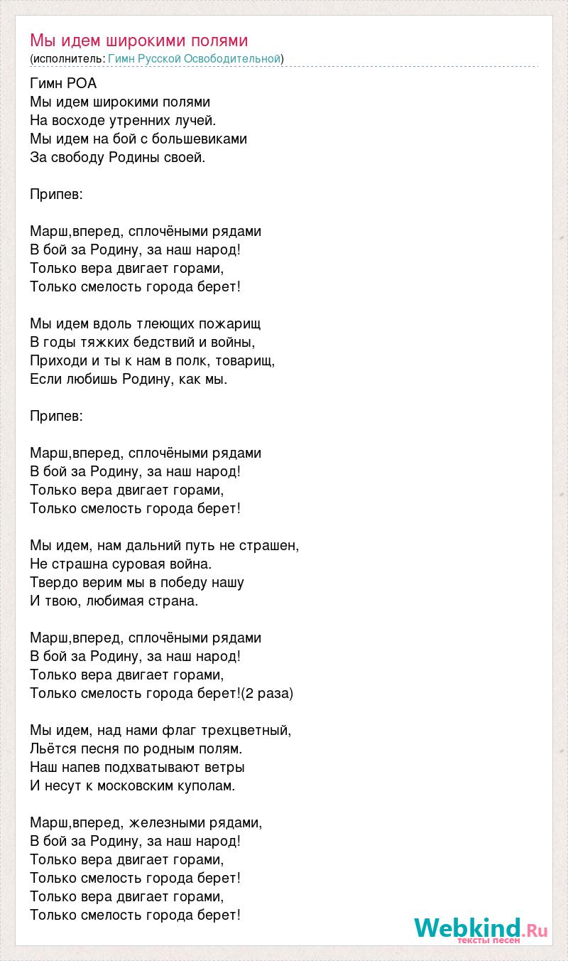 Гимн РОА Мы идем широкими полями На восходе утренних лучей. Мы идем на бой с большевиками За свободу Родины своей. Припев: Марш,вперед, сплочёными рядами В бой за Родину, за наш народ! Только вера двигает горами, Только смелость города берет! Мы идем вдоль тлеющих пожарищ В годы тяжких бедствий и войны, Приходи и ты к нам в полк, товарищ, Если любишь Родину, как мы. Припев: Марш,вперед, сплочёными рядами В бой за Родину, за наш народ! Только вера двигает горами, Только смелость города берет! Мы идем, нам дальний путь не страшен, Не страшна суровая война. Твердо верим мы в победу нашу И твою, любимая страна. Марш,вперед, сплочёными рядами В бой за Родину, за наш народ! Только вера двигает горами, Только смелость города берет!(2 раза) Мы идем, над нами флаг трехцветный, Льётся песня по родным полям. Наш напев подхватывают ветры И несут к московским куполам. Марш,вперед, железными рядами, В бой за Родину, за наш народ! Только вера двигает горами, Только смелость города берет! Только вера двигает горами, Только смелость города берет!