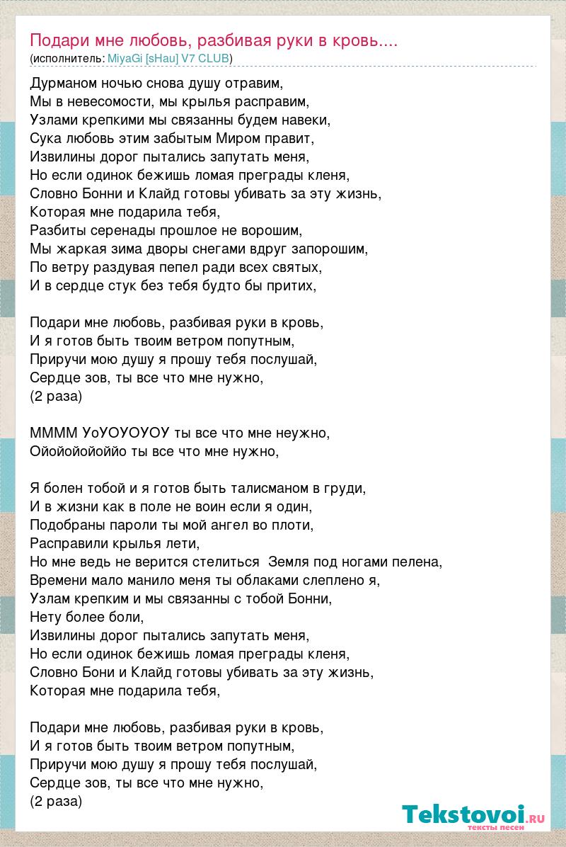 Дурманом ночью снова душу отравим, Мы в невесомости, мы крылья расправим, Узлами крепкими мы связанны будем навеки, Сука любовь этим забытым Миром правит, Извилины дорог пытались запутать меня, Но если одинок бежишь ломая преграды кленя, Словно Бонни и Клайд готовы убивать за эту жизнь, Которая мне подарила тебя, Разбиты серенады прошлое не ворошим, Мы жаркая зима дворы снегами вдруг запорошим, По ветру раздувая пепел ради всех святых, И в сердце стук без тебя будто бы притих, Подари мне любовь, разбивая руки в кровь, И я готов быть твоим ветром попутным, Приручи мою душу я прошу тебя послушай, Сердце зов, ты все что мне нужно, (2 раза) ММММ УоУОУОУОУ ты все что мне неужно, Ойойойойоййо ты все что мне нужно, Я болен тобой и я готов быть талисманом в груди, И в жизни как в поле не воин если я один, Подобраны пароли ты мой ангел во плоти, Расправили крылья лети, Но мне ведь не верится стелиться Земля под ногами пелена, Времени мало манило меня ты облаками слеплено я, Узлам крепким и мы связанны с тобой Бонни, Нету более боли, Извилины дорог пытались запутать меня, Но если одинок бежишь ломая преграды кленя, Словно Бони и Клайд готовы убивать за эту жизнь, Которая мне подарила тебя, Подари мне любовь, разбивая руки в кровь, И я готов быть твоим ветром попутным, Приручи мою душу я прошу тебя послушай, Сердце зов, ты все что мне нужно, (2 раза)