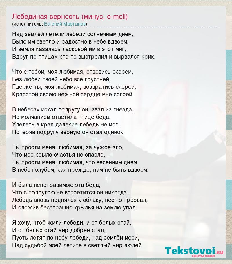 Над землей летели лебеди солнечным днем, Было им светло и радостно в небе вдвоем, И земля казалась ласковой им в этот миг, Вдруг по птицам кто-то выстрелил и вырвался крик. Что с тобой, моя любимая, отзовись скорей, Без любви твоей небо всё грустней, Где же ты, моя любимая, возвратись скорей, Красотой своею нежной сердце мне согрей. В небесах искал подругу он, звал из гнезда, Но молчанием ответила птице беда, Улететь в края далекие лебедь не мог, Потеряв подругу верную он стал одинок. Ты прости меня, любимая, за чужое зло, Что мое крыло счастья не спасло, Ты прости меня, любимая, что весенним днем В небе голубом, как прежде, нам не быть вдвоем. И была непоправимою эта беда, Что с подругою не встретится он никогда, Лебедь вновь поднялся к облаку, песню прервал, И сложив бесстрашно крылья на землю упал. Я хочу, чтоб жили лебеди, и от белых стай, И от белых стай мир добрее стал, Пусть летят по небу лебеди, над землёй моей, Над судьбой моей летите в светлый мир людей
