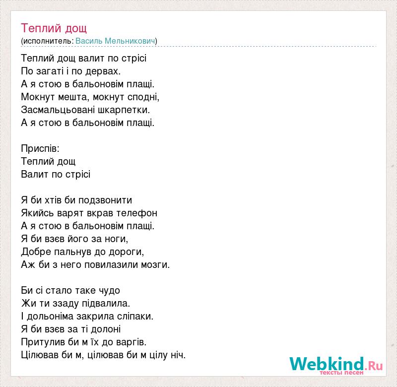 Теплий дощ валит по стрісі По загаті і по дервах. А я стою в бальоновім плащі. Мокнут мешта, мокнут сподні, Засмальцьовані шкарпетки. А я стою в бальоновім плащі. Приспів: Теплий дощ Валит по стрісі Я би хтів би подзвонити Якийсь варят вкрав телефон А я стою в бальоновім плащі. Я би взєв його за ноги, Добре пальнув до дороги, Аж би з него повилазили мозги. Би сі стало таке чудо Жи ти ззаду підвалила. І дольоніма закрила сліпаки. Я би взєв за ті долоні Притулив би м їх до варгів. Цілював би м, цілював би м цілу ніч.