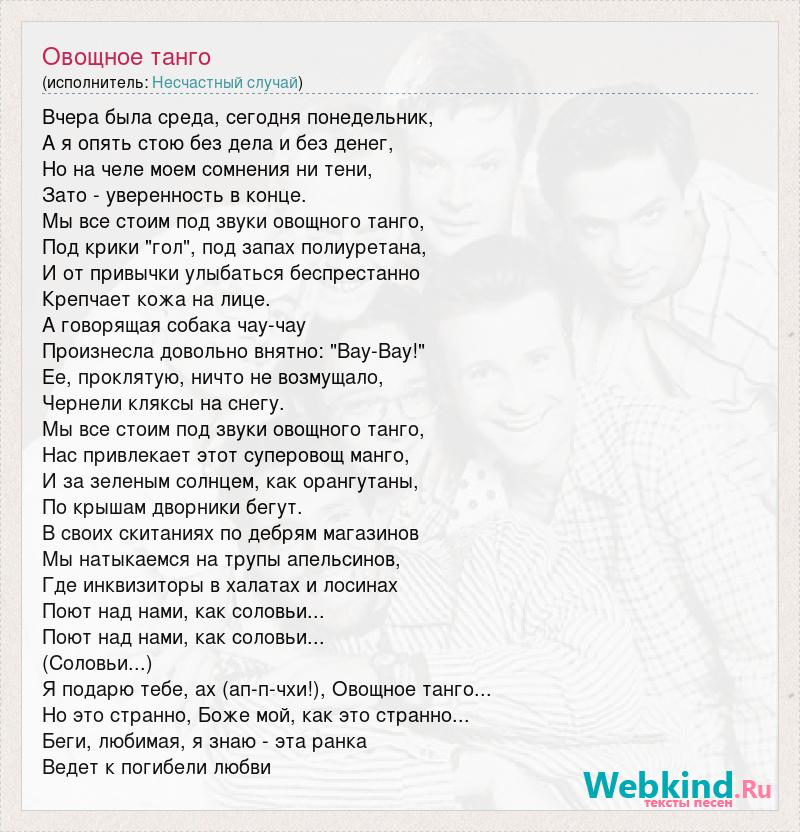 Вчера была среда, сегодня понедельник, А я опять стою без дела и без денег, Но на челе моем сомнения ни тени, Зато - уверенность в конце. Мы все стоим под звуки овощного танго, Под крики "гол", под запах полиуретана, И от привычки улыбаться беспрестанно Крепчает кожа на лице. А говорящая собака чау-чау Произнесла довольно внятно: "Вау-Вау!" Ее, проклятую, ничто не возмущало, Чернели кляксы на снегу. Мы все стоим под звуки овощного танго, Нас привлекает этот суперовощ манго, И за зеленым солнцем, как орангутаны, По крышам дворники бегут. В своих скитаниях по дебрям магазинов Мы натыкаемся на трупы апельсинов, Где инквизиторы в халатах и лосинах Поют над нами, как соловьи... Поют над нами, как соловьи... (Соловьи...) Я подарю тебе, ах (ап-п-чхи!), Овощное танго... Но это странно, Боже мой, как это странно... Беги, любимая, я знаю - эта ранка Ведет к погибели любви