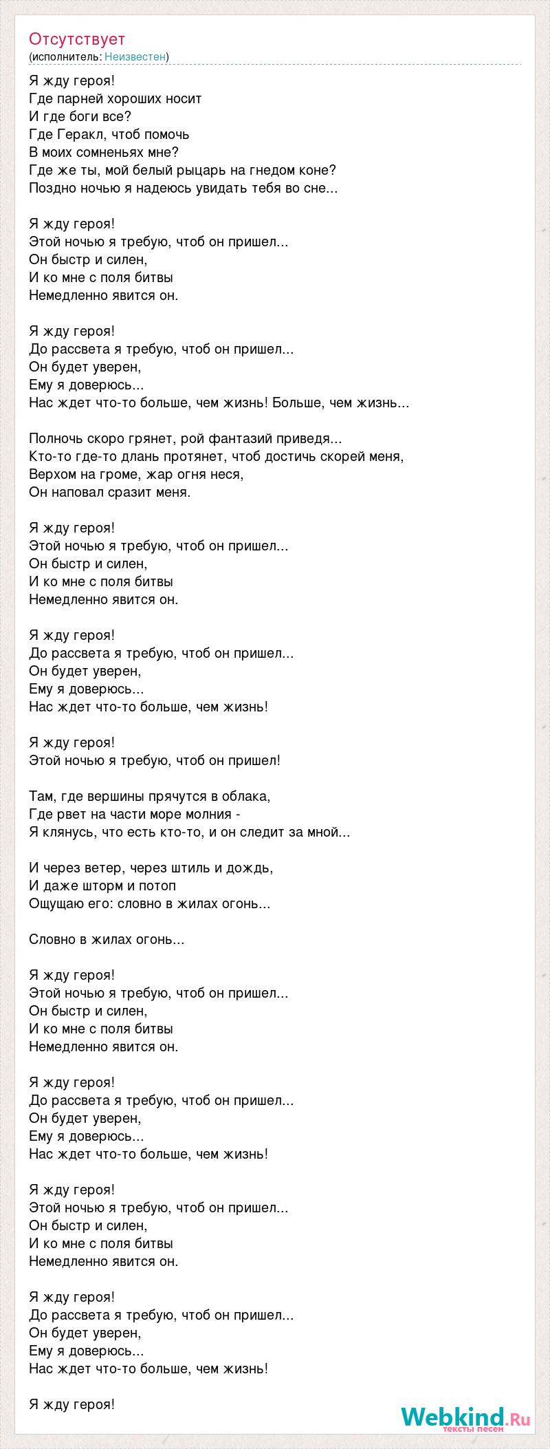 Я жду героя! Где парней хороших носит И где боги все? Где Геракл, чтоб помочь В моих сомненьях мне? Где же ты, мой белый рыцарь на гнедом коне? Поздно ночью я надеюсь увидать тебя во сне... Я жду героя! Этой ночью я требую, чтоб он пришел... Он быстр и силен, И ко мне с поля битвы Немедленно явится он. Я жду героя! До рассвета я требую, чтоб он пришел... Он будет уверен, Ему я доверюсь... Нас ждет что-то больше, чем жизнь! Больше, чем жизнь... Полночь скоро грянет, рой фантазий приведя... Кто-то где-то длань протянет, чтоб достичь скорей меня, Верхом на громе, жар огня неся, Он наповал сразит меня. Я жду героя! Этой ночью я требую, чтоб он пришел... Он быстр и силен, И ко мне с поля битвы Немедленно явится он. Я жду героя! До рассвета я требую, чтоб он пришел... Он будет уверен, Ему я доверюсь... Нас ждет что-то больше, чем жизнь! Я жду героя! Этой ночью я требую, чтоб он пришел! Там, где вершины прячутся в облака, Где рвет на части море молния - Я клянусь, что есть кто-то, и он следит за мной... И через ветер, через штиль и дождь, И даже шторм и потоп Ощущаю его: словно в жилах огонь... Словно в жилах огонь... Я жду героя! Этой ночью я требую, чтоб он пришел... Он быстр и силен, И ко мне с поля битвы Немедленно явится он. Я жду героя! До рассвета я требую, чтоб он пришел... Он будет уверен, Ему я доверюсь... Нас ждет что-то больше, чем жизнь! Я жду героя! Этой ночью я требую, чтоб он пришел... Он быстр и силен, И ко мне с поля битвы Немедленно явится он. Я жду героя! До рассвета я требую, чтоб он пришел... Он будет уверен, Ему я доверюсь... Нас ждет что-то больше, чем жизнь! Я жду героя!