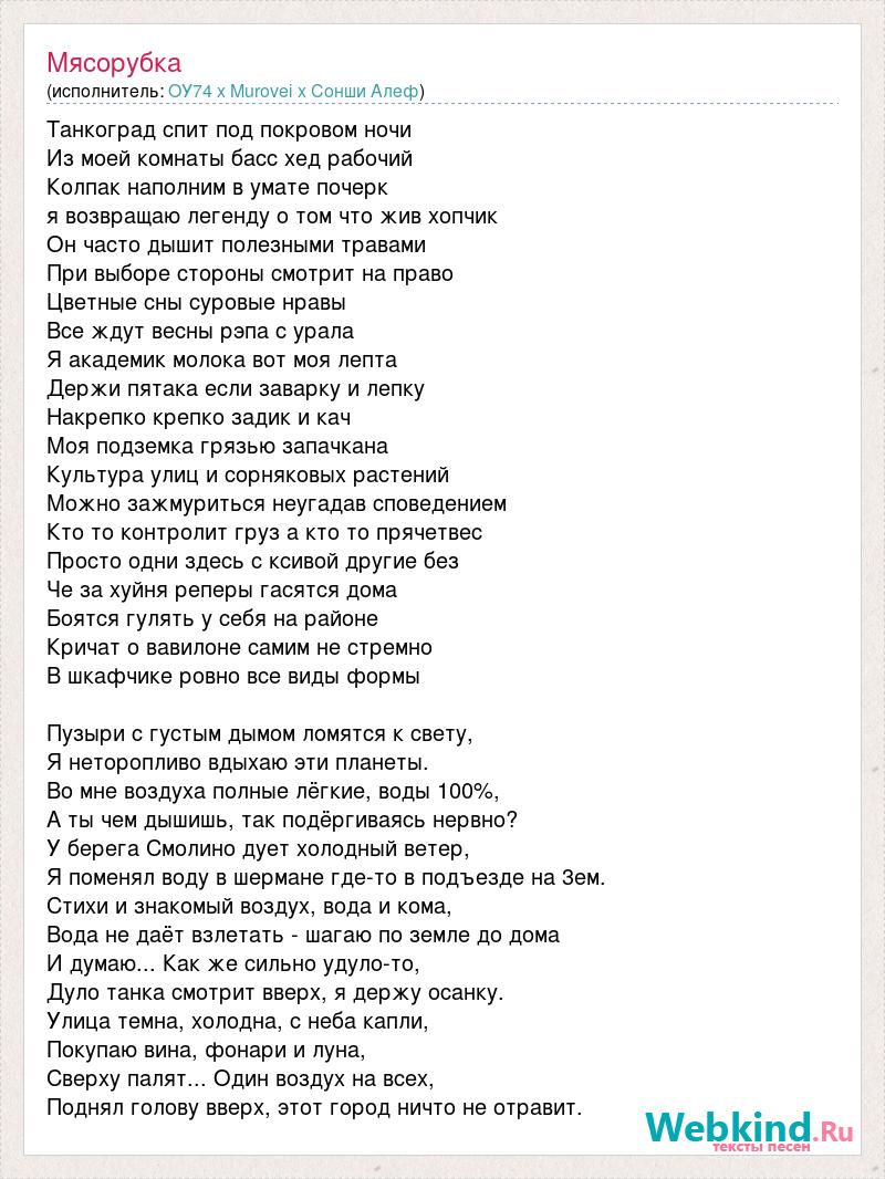 Танкоград спит под покровом ночи Из моей комнаты басс хед рабочий Колпак наполним в умате почерк я возвращаю легенду о том что жив хопчик Он часто дышит полезными травами При выборе стороны смотрит на право Цветные сны суровые нравы Все ждут весны рэпа с урала Я академик молока вот моя лепта Держи пятака если заварку и лепку Накрепко крепко задик и кач Моя подземка грязью запачкана Культура улиц и сорняковых растений Можно зажмуриться неугадав споведением Кто то контролит груз а кто то прячетвес Просто одни здесь с ксивой другие без Че за хуйня реперы гасятся дома Боятся гулять у себя на районе Кричат о вавилоне самим не стремно В шкафчике ровно все виды формы Пузыри с густым дымом ломятся к свету, Я неторопливо вдыхаю эти планеты. Во мне воздуха полные лёгкие, воды 100%, А ты чем дышишь, так подёргиваясь нервно? У берега Смолино дует холодный ветер, Я поменял воду в шермане где-то в подъезде на 3ем. Стихи и знакомый воздух, вода и кома, Вода не даёт взлетать - шагаю по земле до дома И думаю... Как же сильно удуло-то, Дуло танка смотрит вверх, я держу осанку. Улица темна, холодна, с неба капли, Покупаю вина, фонари и луна, Сверху палят... Один воздух на всех, Поднял голову вверх, этот город ничто не отравит.