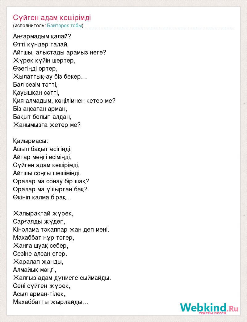 Аңғармадым қалай? Өтті күндер талай, Айтшы, алыстады арамыз неге? Жүрек күйін шертер, Өзегіңді өртер, Жылаттық-ау біз бекер… Бал сезім тәтті, Қауышқан сәтті, Қия алмадым, көңілімнен кетер ме? Біз аңсаған арман, Бақыт болып алдан, Жанымызға жетер ме? Қайырмасы: Ашып бақыт есігіңді, Айтар мәңгі есіміңді, Сүйген адам кешірімді, Айтшы соңғы шешіміңді. Оралар ма сонау бір шақ? Оралар ма ұшырған бақ? Өкініп қалма бірақ… Жапырақтай жүрек, Сарғаяды жүдеп, Кінәлама тәкаппар жан деп мені. Махаббат нұр төгер, Жанға шуақ себер, Сезіне алсаң егер. Жаралап жанды, Алмайық мәңгі, Жалғыз адам дүниеге сыймайды. Сені сүйген жүрек, Асыл арман-тілек, Махаббатты жырлайды…