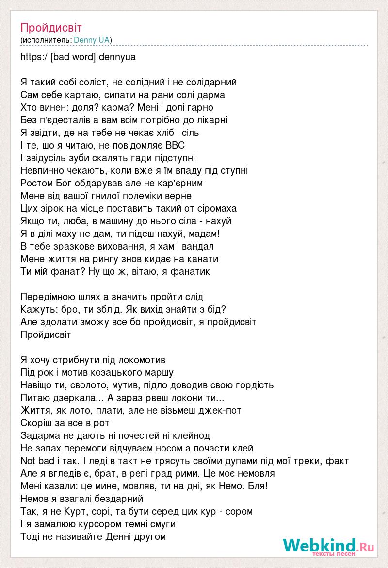 https:/ [bad word] dennyua Я такий собі соліст, не солідний і не солідарний Сам себе картаю, сипати на рани солі дарма Хто винен: доля? карма? Мені і долі гарно Без п'єдесталів а вам всім потрібно до лікарні Я звідти, де на тебе не чекає хліб і сіль І те, шо я читаю, не повідомляє BBC І звідусіль зуби скалять гади підступні Невпинно чекають, коли вже я їм впаду під ступні Ростом Бог обдарував але не кар'єрним Мене від вашої гнилої полеміки верне Цих зірок на місце поставить такий от сіромаха Якщо ти, люба, в машину до нього сіла - нахуй Я в ділі маху не дам, ти підеш нахуй, мадам! В тебе зразкове виховання, я хам і вандал Мене життя на рингу знов кидає на канати Ти мій фанат? Ну що ж, вітаю, я фанатик Передімною шлях а значить пройти слід Кажуть: бро, ти зблід. Як вихід знайти з бід? Але здолати зможу все бо пройдисвіт, я пройдисвіт Пройдисвіт Я хочу стрибнути під локомотив Під рок і мотив козацького маршу Навіщо ти, сволото, мутив, підло доводив свою гордість Питаю дзеркала... А зараз рвеш локони ти... Життя, як лото, плати, але не візьмеш джек-пот Скоріш за все в рот Задарма не дають ні почестей ні клейнод Не запах перемоги відчуваєм носом а почасти клей Not bad і так. І леді в такт не трясуть своїми дупами під мої треки, факт Але я вгледів є, брат, в репі град рими. Це моє немовля Мені казали: це мине, мовляв, ти на дні, як Немо. Бля! Немов я взагалі бездарний Так, я не Курт, сорі, та бути серед цих кур - сором І я замалюю курсором темні смуги Тоді не називайте Денні другом