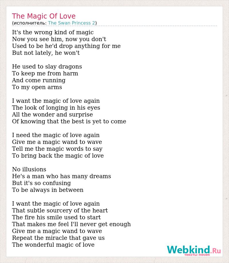 It's the wrong kind of magic Now you see him, now you don't Used to be he'd drop anything for me But not lately, he won't He used to slay dragons To keep me from harm And come running To my open arms I want the magic of love again The look of longing in his eyes All the wonder and surprise Of knowing that the best is yet to come I need the magic of love again Give me a magic wand to wave Tell me the magic words to say To bring back the magic of love No illusions He's a man who has many dreams But it's so confusing To be always in between I want the magic of love again That subtle sourcery of the heart The fire his smile used to start That makes me feel I'll never get enough Give me a magic wand to wave Repeat the miracle that gave us The wonderful magic of love
