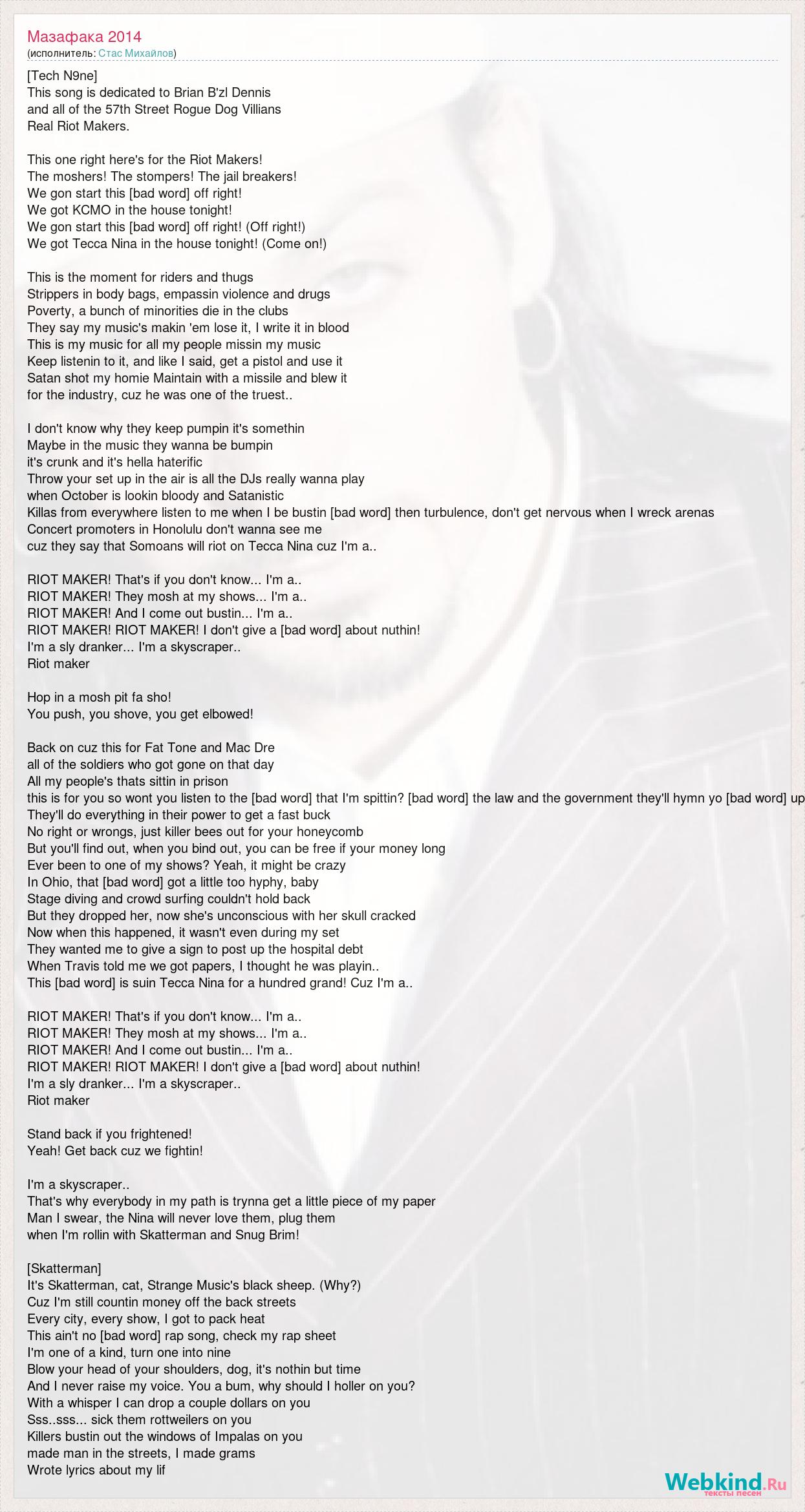 [Tech N9ne] This song is dedicated to Brian B'zl Dennis and all of the 57th Street Rogue Dog Villians Real Riot Makers. This one right here's for the Riot Makers! The moshers! The stompers! The jail breakers! We gon start this [bad word] off right! We got KCMO in the house tonight! We gon start this [bad word] off right! (Off right!) We got Tecca Nina in the house tonight! (Come on!) This is the moment for riders and thugs Strippers in body bags, empassin violence and drugs Poverty, a bunch of minorities die in the clubs They say my music's makin 'em lose it, I write it in blood This is my music for all my people missin my music Keep listenin to it, and like I said, get a pistol and use it Satan shot my homie Maintain with a missile and blew it for the industry, cuz he was one of the truest.. I don't know why they keep pumpin it's somethin Maybe in the music they wanna be bumpin it's crunk and it's hella haterific Throw your set up in the air is all the DJs really wanna play when October is lookin bloody and Satanistic Killas from everywhere listen to me when I be bustin [bad word] then turbulence, don't get nervous when I wreck arenas Concert promoters in Honolulu don't wanna see me cuz they say that Somoans will riot on Tecca Nina cuz I'm a.. RIOT MAKER! That's if you don't know... I'm a.. RIOT MAKER! They mosh at my shows... I'm a.. RIOT MAKER! And I come out bustin... I'm a.. RIOT MAKER! RIOT MAKER! I don't give a [bad word] about nuthin! I'm a sly dranker... I'm a skyscraper.. Riot maker Hop in a mosh pit fa sho! You push, you shove, you get elbowed! Back on cuz this for Fat Tone and Mac Dre all of the soldiers who got gone on that day All my people's thats sittin in prison this is for you so wont you listen to the [bad word] that I'm spittin? [bad word] the law and the government they'll hymn yo [bad word] up They'll do everything in their power to get a fast buck No right or wrongs, just killer bees out for your honeycomb But you'll find out, when you bind out, you can be free if your money long Ever been to one of my shows? Yeah, it might be crazy In Ohio, that [bad word] got a little too hyphy, baby Stage diving and crowd surfing couldn't hold back But they dropped her, now she's unconscious with her skull cracked Now when this happened, it wasn't even during my set They wanted me to give a sign to post up the hospital debt When Travis told me we got papers, I thought he was playin.. This [bad word] is suin Tecca Nina for a hundred grand! Cuz I'm a.. RIOT MAKER! That's if you don't know... I'm a.. RIOT MAKER! They mosh at my shows... I'm a.. RIOT MAKER! And I come out bustin... I'm a.. RIOT MAKER! RIOT MAKER! I don't give a [bad word] about nuthin! I'm a sly dranker... I'm a skyscraper.. Riot maker Stand back if you frightened! Yeah! Get back cuz we fightin! I'm a skyscraper.. That's why everybody in my path is trynna get a little piece of my paper Man I swear, the Nina will never love them, plug them when I'm rollin with Skatterman and Snug Brim! [Skatterman] It's Skatterman, cat, Strange Music's black sheep. (Why?) Cuz I'm still countin money off the back streets Every city, every show, I got to pack heat This ain't no [bad word] rap song, check my rap sheet I'm one of a kind, turn one into nine Blow your head of your shoulders, dog, it's nothin but time And I never raise my voice. You a bum, why should I holler on you? With a whisper I can drop a couple dollars on you Sss..sss... sick them rottweilers on you Killers bustin out the windows of Impalas on you made man in the streets, I made grams Wrote lyrics about my lif