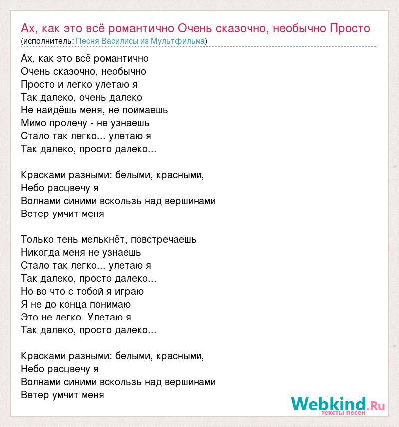 Главная→Исполнители→Песня Василисы из Мультфильма Иван Царевич и серый волк→Ах, как это всё романтично Очень сказочно, необычно Просто и легко улетаю я