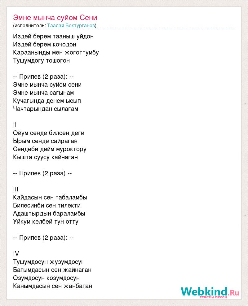 Издей берем тааныш уйдон Издей берем кочодон Караанынды мен жоготтумбу Тушумдогу тошогон -- Припев (2 раза): -- Эмне мынча суйом сени Эмне мынча сагынам Кучагында денем ысып Чачтарындан сылагам II Ойум сенде билсен деги Ырым сенде сайраган Сендеби дейм муроктору Кышта суусу кайнаган -- Припев (2 раза) -- III Кайдасын сен табаламбы Билесинби сен тилекти Адаштырдын бараламбы Уйкум келбей тун отту -- Припев (2 раза): -- IV Тушумдосун жузумдосун Багымдасын сен жайнаган Озумдосун козумдосун Канымдасын сен жанбаган