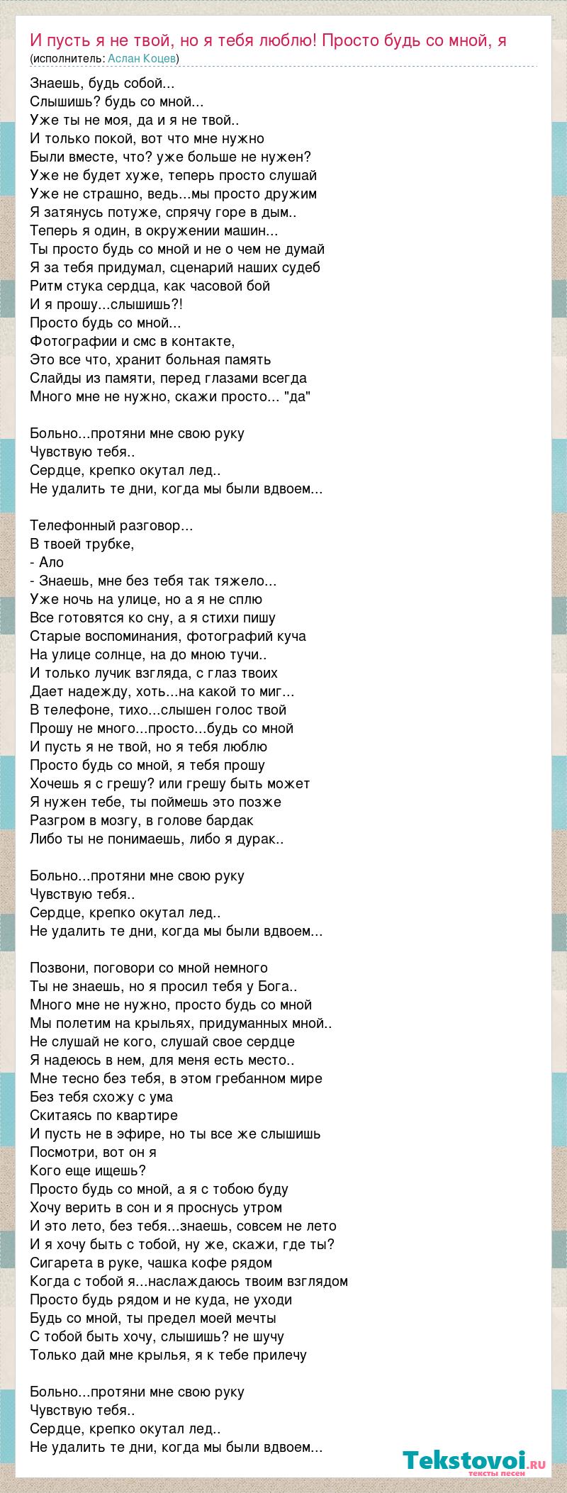 Знаешь, будь собой... Слышишь? будь со мной... Уже ты не моя, да и я не твой.. И только покой, вот что мне нужно Были вместе, что? уже больше не нужен? Уже не будет хуже, теперь просто слушай Уже не страшно, ведь...мы просто дружим Я затянусь потуже, спрячу горе в дым.. Теперь я один, в окружении машин... Ты просто будь со мной и не о чем не думай Я за тебя придумал, сценарий наших судеб Ритм стука сердца, как часовой бой И я прошу...слышишь?! Просто будь со мной... Фотографии и смс в контакте, Это все что, хранит больная память Слайды из памяти, перед глазами всегда Много мне не нужно, скажи просто... "да" Больно...протяни мне свою руку Чувствую тебя.. Сердце, крепко окутал лед.. Не удалить те дни, когда мы были вдвоем... Телефонный разговор... В твоей трубке, - Ало - Знаешь, мне без тебя так тяжело... Уже ночь на улице, но а я не сплю Все готовятся ко сну, а я стихи пишу Старые воспоминания, фотографий куча На улице солнце, на до мною тучи.. И только лучик взгляда, с глаз твоих Дает надежду, хоть...на какой то миг... В телефоне, тихо...слышен голос твой Прошу не много...просто...будь со мной И пусть я не твой, но я тебя люблю Просто будь со мной, я тебя прошу Хочешь я с грешу? или грешу быть может Я нужен тебе, ты поймешь это позже Разгром в мозгу, в голове бардак Либо ты не понимаешь, либо я дурак.. Больно...протяни мне свою руку Чувствую тебя.. Сердце, крепко окутал лед.. Не удалить те дни, когда мы были вдвоем... Позвони, поговори со мной немного Ты не знаешь, но я просил тебя у Бога.. Много мне не нужно, просто будь со мной Мы полетим на крыльях, придуманных мной.. Не слушай не кого, слушай свое сердце Я надеюсь в нем, для меня есть место.. Мне тесно без тебя, в этом гребанном мире Без тебя схожу с ума Скитаясь по квартире И пусть не в эфире, но ты все же слышишь Посмотри, вот он я Кого еще ищешь? Просто будь со мной, а я с тобою буду Хочу верить в сон и я проснусь утром И это лето, без тебя...знаешь, совсем не лето И я хочу быть с тобой, ну же, скажи, где ты? Сигарета в руке, чашка кофе рядом Когда с тобой я...наслаждаюсь твоим взглядом Просто будь рядом и не куда, не уходи Будь со мной, ты предел моей мечты С тобой быть хочу, слышишь? не шучу Только дай мне крылья, я к тебе прилечу Больно...протяни мне свою руку Чувствую тебя.. Сердце, крепко окутал лед.. Не удалить те дни, когда мы были вдвоем...