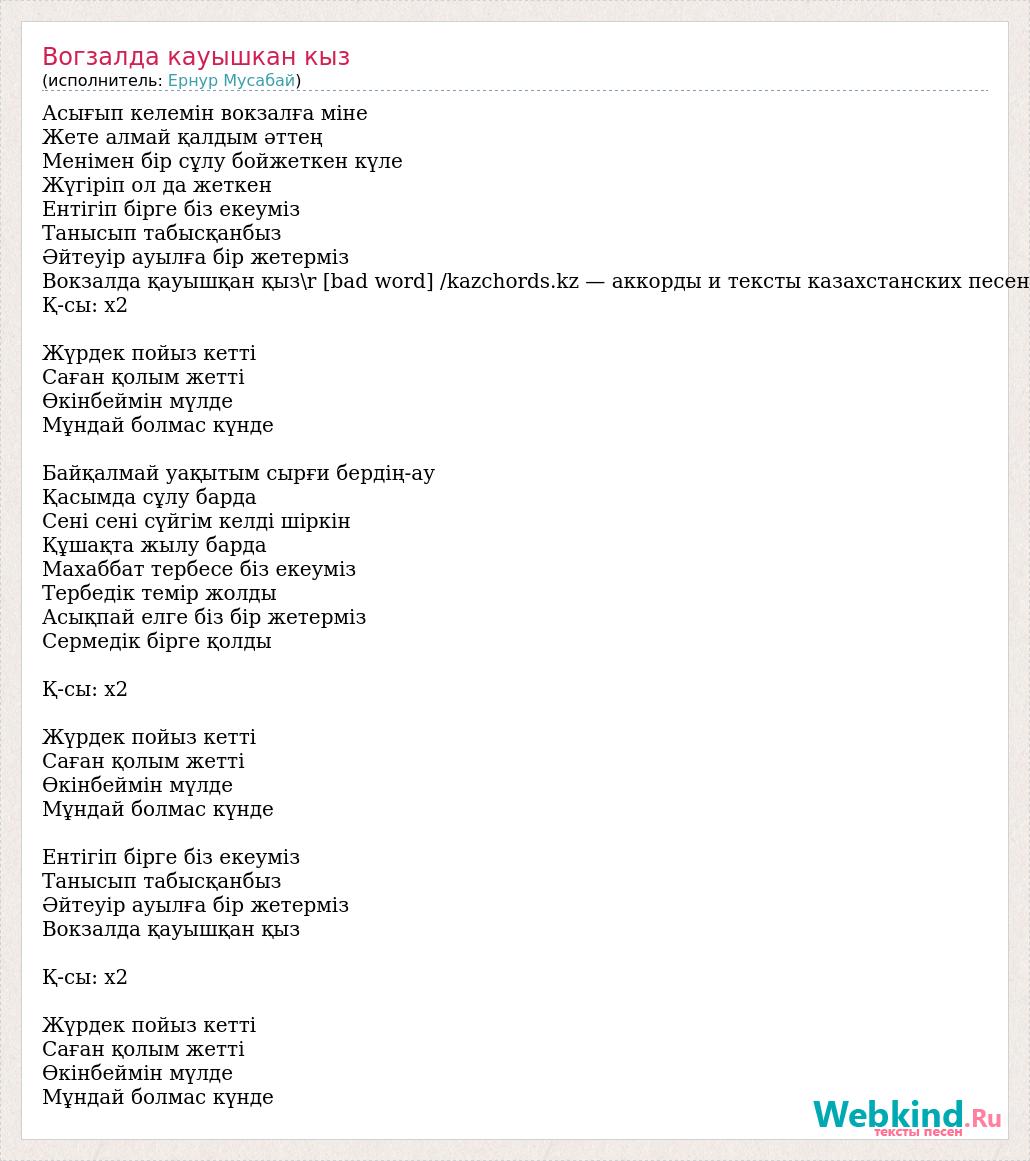 Асығып келемін вокзалға міне Жете алмай қалдым әттең Менімен бір сұлу бойжеткен күле Жүгіріп ол да жеткен Ентігіп бірге біз екеуміз Танысып табысқанбыз Әйтеуір ауылға бір жетерміз Вокзалда қауышқан қыз\r [bad word] /kazchords.kz — аккорды и тексты казахстанских песен Қ-сы: х2 Жүрдек пойыз кетті Саған қолым жетті Өкінбеймін мүлде Мұндай болмас күнде Байқалмай уақытым сырғи бердің-ау Қасымда сұлу барда Сені сені сүйгім келді шіркін Құшақта жылу барда Махаббат тербесе біз екеуміз Тербедік темір жолды Асықпай елге біз бір жетерміз Сермедік бірге қолды Қ-сы: х2 Жүрдек пойыз кетті Саған қолым жетті Өкінбеймін мүлде Мұндай болмас күнде Ентігіп бірге біз екеуміз Танысып табысқанбыз Әйтеуір ауылға бір жетерміз Вокзалда қауышқан қыз Қ-сы: х2 Жүрдек пойыз кетті Саған қолым жетті Өкінбеймін мүлде Мұндай болмас күнде