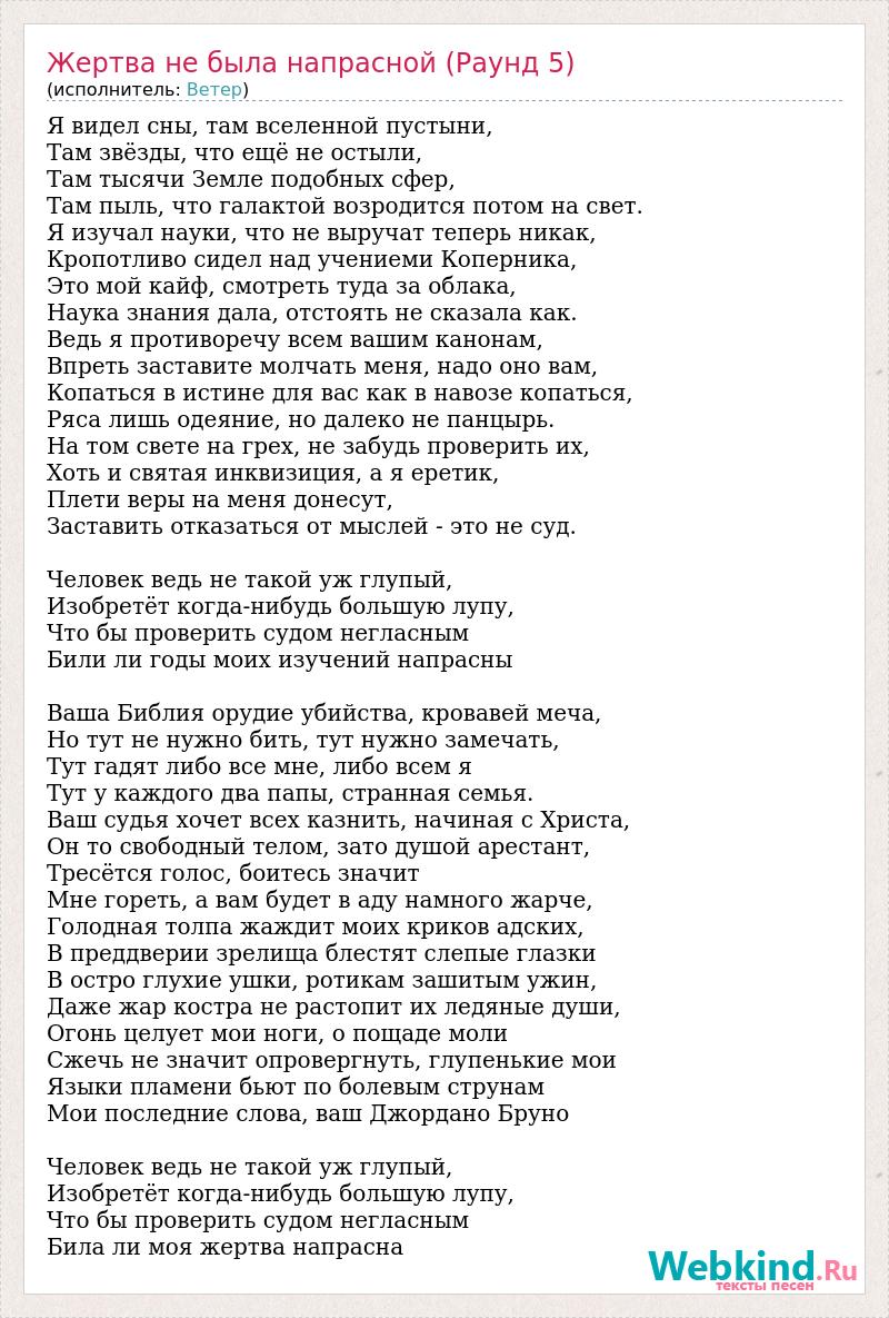 Я видел сны, там вселенной пустыни, Там звёзды, что ещё не остыли, Там тысячи Земле подобных сфер, Там пыль, что галактой возродится потом на свет. Я изучал науки, что не выручат теперь никак, Кропотливо сидел над учениеми Коперника, Это мой кайф, смотреть туда за облака, Наука знания дала, отстоять не сказала как. Ведь я противоречу всем вашим канонам, Впреть заставите молчать меня, надо оно вам, Копаться в истине для вас как в навозе копаться, Ряса лишь одеяние, но далеко не панцырь. На том свете на грех, не забудь проверить их, Хоть и святая инквизиция, а я еретик, Плети веры на меня донесут, Заставить отказаться от мыслей - это не суд. Человек ведь не такой уж глупый, Изобретёт когда-нибудь большую лупу, Что бы проверить судом негласным Били ли годы моих изучений напрасны Ваша Библия орудие убийства, кровавей меча, Но тут не нужно бить, тут нужно замечать, Тут гадят либо все мне, либо всем я Тут у каждого два папы, странная семья. Ваш судья хочет всех казнить, начиная с Христа, Он то свободный телом, зато душой арестант, Тресётся голос, боитесь значит Мне гореть, а вам будет в аду намного жарче, Голодная толпа жаждит моих криков адских, В преддверии зрелища блестят слепые глазки В остро глухие ушки, ротикам зашитым ужин, Даже жар костра не растопит их ледяные души, Огонь целует мои ноги, о пощаде моли Сжечь не значит опровергнуть, глупенькие мои Языки пламени бьют по болевым струнам Мои последние слова, ваш Джордано Бруно Человек ведь не такой уж глупый, Изобретёт когда-нибудь большую лупу, Что бы проверить судом негласным Била ли моя жертва напрасна