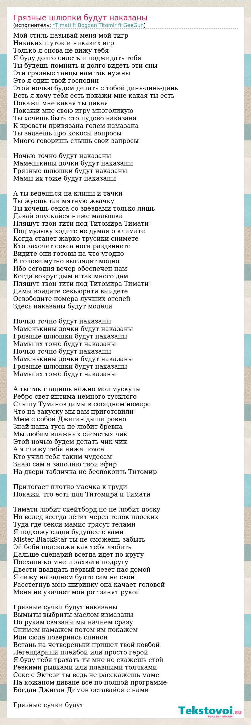 Мой стиль называй меня мой тигр Никаких шуток и никаких игр Только я снова не вижу тебя Я буду долго сидеть и поджидать тебя Ты будешь помнить и долго видеть эти сны Эти грязные танцы нам так нужны Это я один твой господин Этой ночью будем делать с тобой динь-динь-динь Есть я хочу тебя есть покажи мне какая ты есть Покажи мне какая ты дикая Покажи мне свою игру многоликую Ты хочешь быть сто пудово наказана К кровати привязана гелем намазана Ты задаешь про кокосы вопросы Много говоришь слышь свои запросы Ночью точно будут наказаны Маменькины дочки будут наказаны Грязные шлюшки будут наказаны Мамы их тоже будут наказаны А ты ведешься на клипы и тачки Ты жуешь так мятную жвачку Ты хочешь секса со звездами только лишь Давай опускайся ниже малышка Пляшут твои тити под Титомира Тимати Под музыку ходите не думая о климате Когда станет жарко трусики снимете Кто захочет секса ноги раздвинете Видите они готовы на что угодно В голове мутно выглядят модно Ибо сегодня вечер обеспечен нам Когда вокруг дым и так много дам Пляшут твои тити под Титомира Тимати Дамы войдите секьюрити выйдете Освободите номера лучших отелей Здесь наказаны будут модели Ночью точно будут наказаны Маменькины дочки будут наказаны Грязные шлюшки будут наказаны Мамы их тоже будут наказаны Ночью точно будут наказаны Маменькины дочки будут наказаны Грязные шлюшки будут наказаны Мамы их тоже будут наказаны А ты так гладишь нежно мои мускулы Ребро свет интима немного тусклого Слышу Туманов дамы в соседнем номере Что на закуску мы вам приготовили Ммм с собой Джиган дыши ровно Знай наша туса не любит бревна Мы любим влажных сисястых чик Этой ночью будем делать чик-чик А я глажу тебя ниже пояса Кто учил тебя таким чудесам Знаю сам я заполню твой эфир На двери табличка не беспокоить Титомир Прилегает плотно маечка к груди Покажи что есть для Титомира и Тимати Тимати любит скейтборд но не любит доску Но вслед всегда летит через телок плоских Туда где секси мамис трясут телами Я подхожу сзади будущее с вами Mister BlackStar ты не сможешь забыть Эй беби подскажи как тебя любить Дальше сценарий всегда идет по кругу Поехали ко мне и захвати подругу Двести двадцать первый везет нас домой Я сижу на заднем будто сам не свой Расстегнув мою ширинку она качает головой Меня не укачает мой рот занят рукой Грязные сучки будут наказаны Вымыты выбриты маслом измазаны По рукам связаны мы начнем сразу Снимем намажем потом им покажем Иди сюда повернись спиной Встань на четвереньки пришел твой ковбой Легендарный плейбой или просто герой Я буду тебя трахать ты мне не скажешь стой Резкими рывками или плавными толчками Секс с Эктези ты ведь не расскажешь маме На кожаном диване всё по полной программе Богдан Джиган Димон оставайся с нами Грязные сучки будут