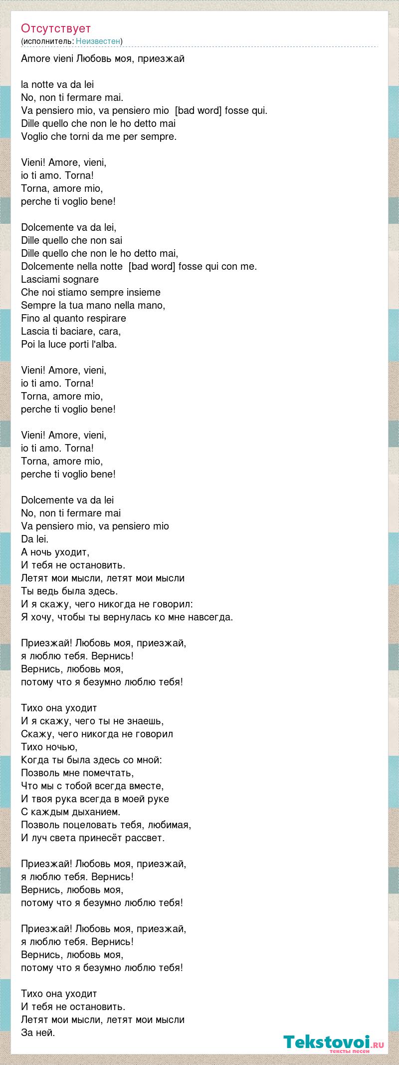 Amore vieni Любовь моя, приезжай la notte va da lei No, non ti fermare mai. Va pensiero mio, va pensiero mio [bad word] fosse qui. Dille quello che non le ho detto mai Voglio che torni da me per sempre. Vieni! Amore, vieni, io ti amo. Torna! Torna, amore mio, perche ti voglio bene! Dolcemente va da lei, Dille quello che non sai Dille quello che non le ho detto mai, Dolcemente nella notte [bad word] fosse qui con me. Lasciami sognare Che noi stiamo sempre insieme Sempre la tua mano nella mano, Fino al quanto respirare Lascia ti baciare, cara, Poi la luce porti l'alba. Vieni! Amore, vieni, io ti amo. Torna! Torna, amore mio, perche ti voglio bene! Vieni! Amore, vieni, io ti amo. Torna! Torna, amore mio, perche ti voglio bene! Dolcemente va da lei No, non ti fermare mai Va pensiero mio, va pensiero mio Da lei. А ночь уходит, И тебя не остановить. Летят мои мысли, летят мои мысли Ты ведь была здесь. И я скажу, чего никогда не говорил: Я хочу, чтобы ты вернулась ко мне навсегда. Приезжай! Любовь моя, приезжай, я люблю тебя. Вернись! Вернись, любовь моя, потому что я безумно люблю тебя! Тихо она уходит И я скажу, чего ты не знаешь, Скажу, чего никогда не говорил Тихо ночью, Когда ты была здесь со мной: Позволь мне помечтать, Что мы с тобой всегда вместе, И твоя рука всегда в моей руке С каждым дыханием. Позволь поцеловать тебя, любимая, И луч света принесёт рассвет. Приезжай! Любовь моя, приезжай, я люблю тебя. Вернись! Вернись, любовь моя, потому что я безумно люблю тебя! Приезжай! Любовь моя, приезжай, я люблю тебя. Вернись! Вернись, любовь моя, потому что я безумно люблю тебя! Тихо она уходит И тебя не остановить. Летят мои мысли, летят мои мысли За ней.
