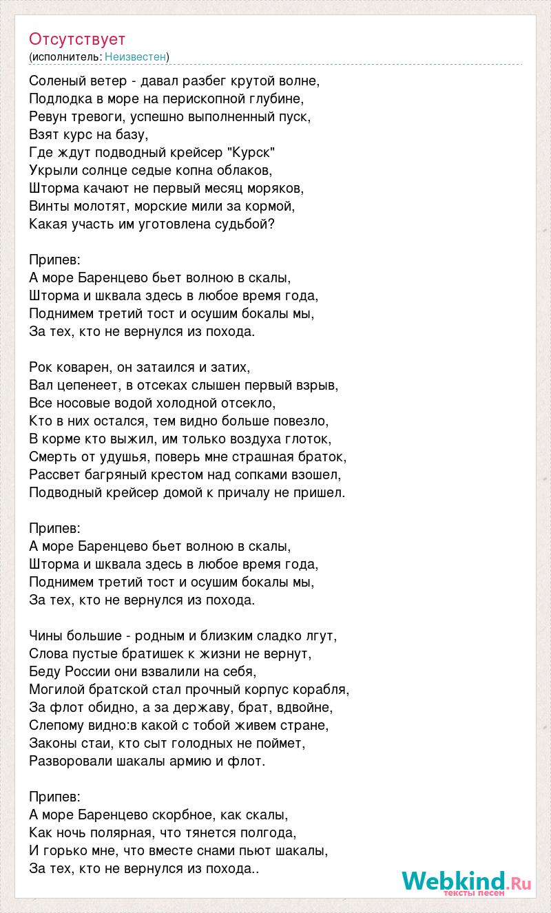 Соленый ветер - давал разбег крутой волне, Подлодка в море на перископной глубине, Ревун тревоги, успешно выполненный пуск, Взят курс на базу, Где ждут подводный крейсер "Курск" Укрыли солнце седые копна облаков, Шторма качают не первый месяц моряков, Винты молотят, морские мили за кормой, Какая участь им уготовлена судьбой? Припев: А море Баренцево бьет волною в скалы, Шторма и шквала здесь в любое время года, Поднимем третий тост и осушим бокалы мы, За тех, кто не вернулся из похода. Рок коварен, он затаился и затих, Вал цепенеет, в отсеках слышен первый взрыв, Все носовые водой холодной отсекло, Кто в них остался, тем видно больше повезло, В корме кто выжил, им только воздуха глоток, Смерть от удушья, поверь мне страшная браток, Рассвет багряный крестом над сопками взошел, Подводный крейсер домой к причалу не пришел. Припев: А море Баренцево бьет волною в скалы, Шторма и шквала здесь в любое время года, Поднимем третий тост и осушим бокалы мы, За тех, кто не вернулся из похода. Чины большие - родным и близким сладко лгут, Слова пустые братишек к жизни не вернут, Беду России они взвалили на себя, Могилой братской стал прочный корпус корабля, За флот обидно, а за державу, брат, вдвойне, Слепому видно:в какой с тобой живем стране, Законы стаи, кто сыт голодных не поймет, Разворовали шакалы армию и флот. Припев: А море Баренцево скорбное, как скалы, Как ночь полярная, что тянется полгода, И горько мне, что вместе снами пьют шакалы, За тех, кто не вернулся из похода..