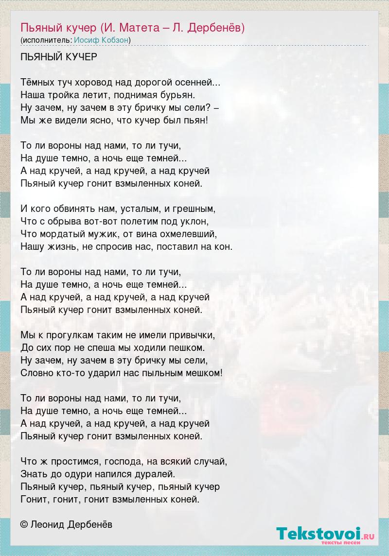 ПЬЯНЫЙ КУЧЕР Тёмных туч хоровод над дорогой осенней... Наша тройка летит, поднимая бурьян. Ну зачем, ну зачем в эту бричку мы сели? − Мы же видели ясно, что кучер был пьян! То ли вороны над нами, то ли тучи, На душе темно, а ночь еще темней... А над кручей, а над кручей, а над кручей Пьяный кучер гонит взмыленных коней. И кого обвинять нам, усталым, и грешным, Что с обрыва вот-вот полетим под уклон, Что мордатый мужик, от вина охмелевший, Нашу жизнь, не спросив нас, поставил на кон. То ли вороны над нами, то ли тучи, На душе темно, а ночь еще темней... А над кручей, а над кручей, а над кручей Пьяный кучер гонит взмыленных коней. Мы к прогулкам таким не имели привычки, До сих пор не спеша мы ходили пешком. Ну зачем, ну зачем в эту бричку мы сели, Словно кто-то ударил нас пыльным мешком! То ли вороны над нами, то ли тучи, На душе темно, а ночь еще темней... А над кручей, а над кручей, а над кручей Пьяный кучер гонит взмыленных коней. Что ж простимся, господа, на всякий случай, Знать до одури напился дуралей. Пьяный кучер, пьяный кучер, пьяный кучер Гонит, гонит, гонит взмыленных коней. © Леонид Дербенёв