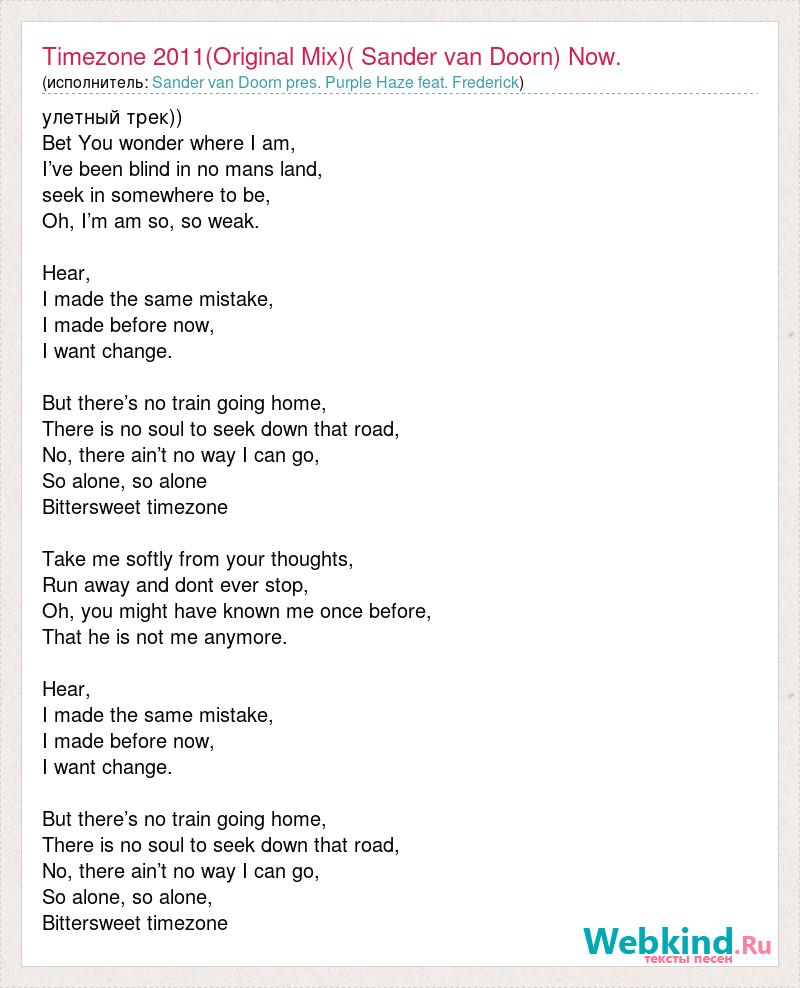 улетный трек)) Bet You wonder where I am, I’ve been blind in no mans land, seek in somewhere to be, Oh, I’m am so, so weak. Hear, I made the same mistake, I made before now, I want change. But there’s no train going home, There is no soul to seek down that road, No, there ain’t no way I can go, So alone, so alone Bittersweet timezone Take me softly from your thoughts, Run away and dont ever stop, Oh, you might have known me once before, That he is not me anymore. Hear, I made the same mistake, I made before now, I want change. But there’s no train going home, There is no soul to seek down that road, No, there ain’t no way I can go, So alone, so alone, Bittersweet timezone