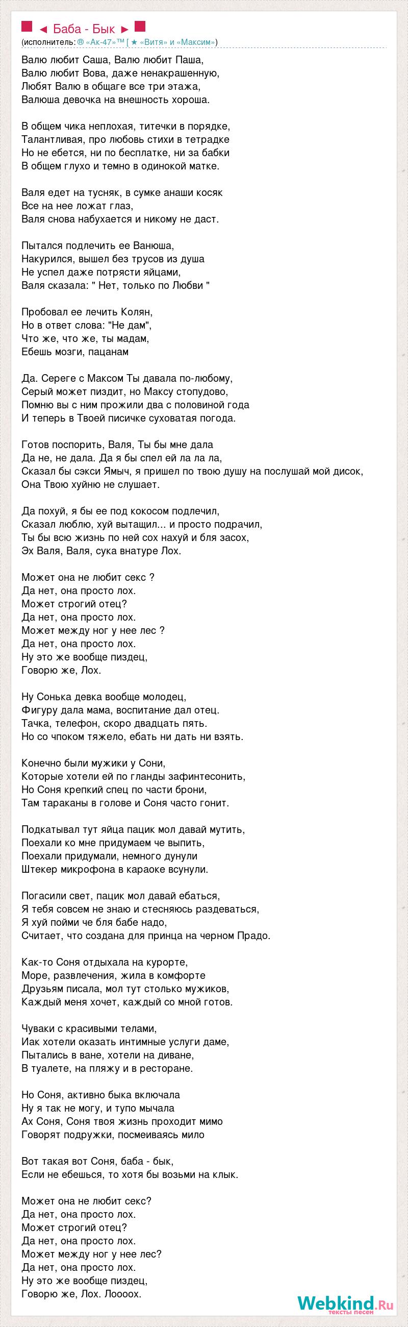 Валю любит Саша, Валю любит Паша, Валю любит Вова, даже ненакрашенную, Любят Валю в общаге все три этажа, Валюша девочка на внешность хороша. В общем чика неплохая, титечки в порядке, Талантливая, про любовь стихи в тетрадке Но не ебется, ни по бесплатке, ни за бабки В общем глухо и темно в одинокой матке. Валя едет на тусняк, в сумке анаши косяк Все на нее ложат глаз, Валя снова набухается и никому не даст. Пытался подлечить ее Ванюша, Накурился, вышел без трусов из душа Не успел даже потрясти яйцами, Валя сказала: " Нет, только по Любви " Пробовал ее лечить Колян, Но в ответ слова: "Не дам", Что же, что же, ты мадам, Ебешь мозги, пацанам Да. Сереге с Максом Tы давала по-любому, Серый может пиздит, но Максу стопудово, Помню вы с ним прожили два с половиной года И теперь в Tвоей писичке суховатая погода. Готов поспорить, Валя, Tы бы мне дала Да не, не дала. Да я бы спел ей ла ла ла, Сказал бы сэкси Ямыч, я пришел по твою душу на послушай мой дисок, Она Tвою хуйню не слушает. Да похуй, я бы ее под кокосом подлечил, Сказал люблю, хуй вытащил... и просто подрачил, Ты бы всю жизнь по ней сох нахуй и бля засох, Эх Валя, Валя, сука внатуре Лох. Может она не любит секс ? Да нет, она просто лох. Может строгий отец? Да нет, она просто лох. Может между ног у нее лес ? Да нет, она просто лох. Ну это же вообще пиздец, Говорю же, Лох. Ну Сонька девка вообще молодец, Фигуру дала мама, воспитание дал отец. Тачка, телефон, скоро двадцать пять. Но со чпоком тяжело, ебать ни дать ни взять. Конечно были мужики у Сони, Которые хотели ей по гланды зафинтесонить, Но Соня крепкий спец по части брони, Там тараканы в голове и Соня часто гонит. Подкатывал тут яйца пацик мол давай мутить, Поехали ко мне придумаем че выпить, Поехали придумали, немного дунули Штекер микрофона в караоке всунули. Погасили свет, пацик мол давай ебаться, Я тебя совсем не знаю и стесняюсь раздеваться, Я хуй пойми че бля бабе надо, Считает, что создана для принца на черном Прадо. Как-то Соня отдыхала на курорте, Море, развлечения, жила в комфорте Друзьям писала, мол тут столько мужиков, Каждый меня хочет, каждый со мной готов. Чуваки с красивыми телами, Иак хотели оказать интимные услуги даме, Пытались в ване, хотели на диване, В туалете, на пляжу и в ресторане. Но Соня, активно быка включала Ну я так не могу, и тупо мычала Ах Соня, Соня твоя жизнь проходит мимо Говорят подружки, посмеиваясь мило Вот такая вот Соня, баба - бык, Если не ебешься, то хотя бы возьми на клык. Может она не любит секс? Да нет, она просто лох. Может строгий отец? Да нет, она просто лох. Может между ног у нее лес? Да нет, она просто лох. Ну это же вообще пиздец, Говорю же, Лох. Лоооох.