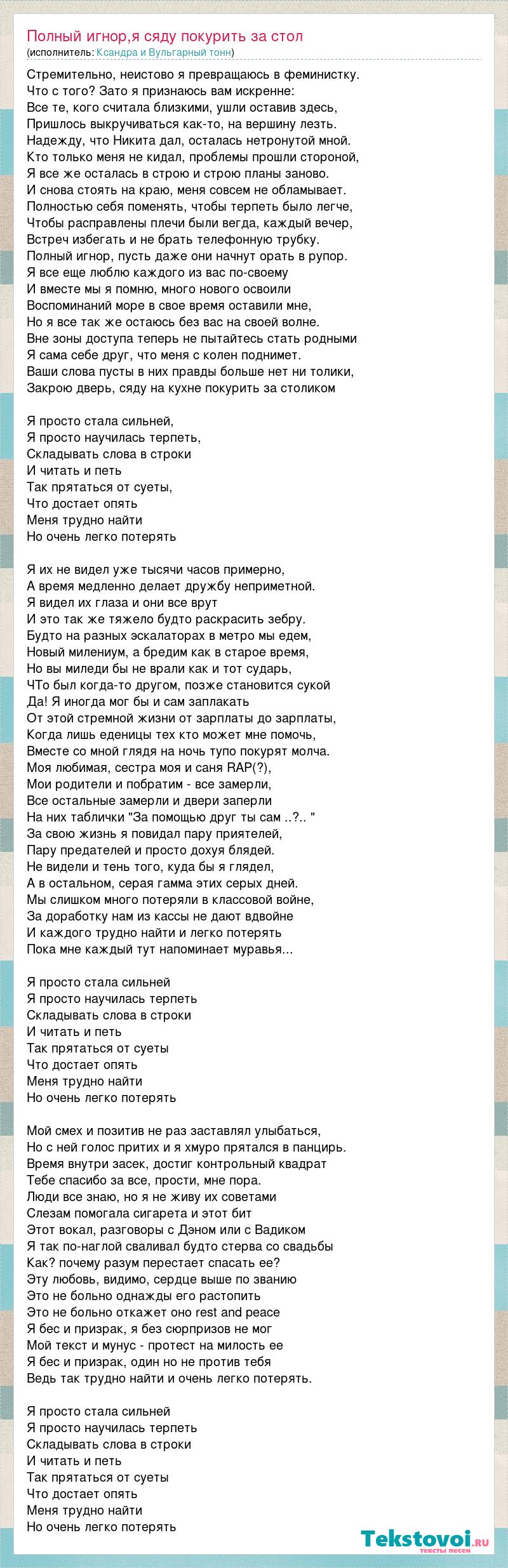 А как ты думаешь, о чем песня "Полный игнор,я сяду покурить за стол" ?