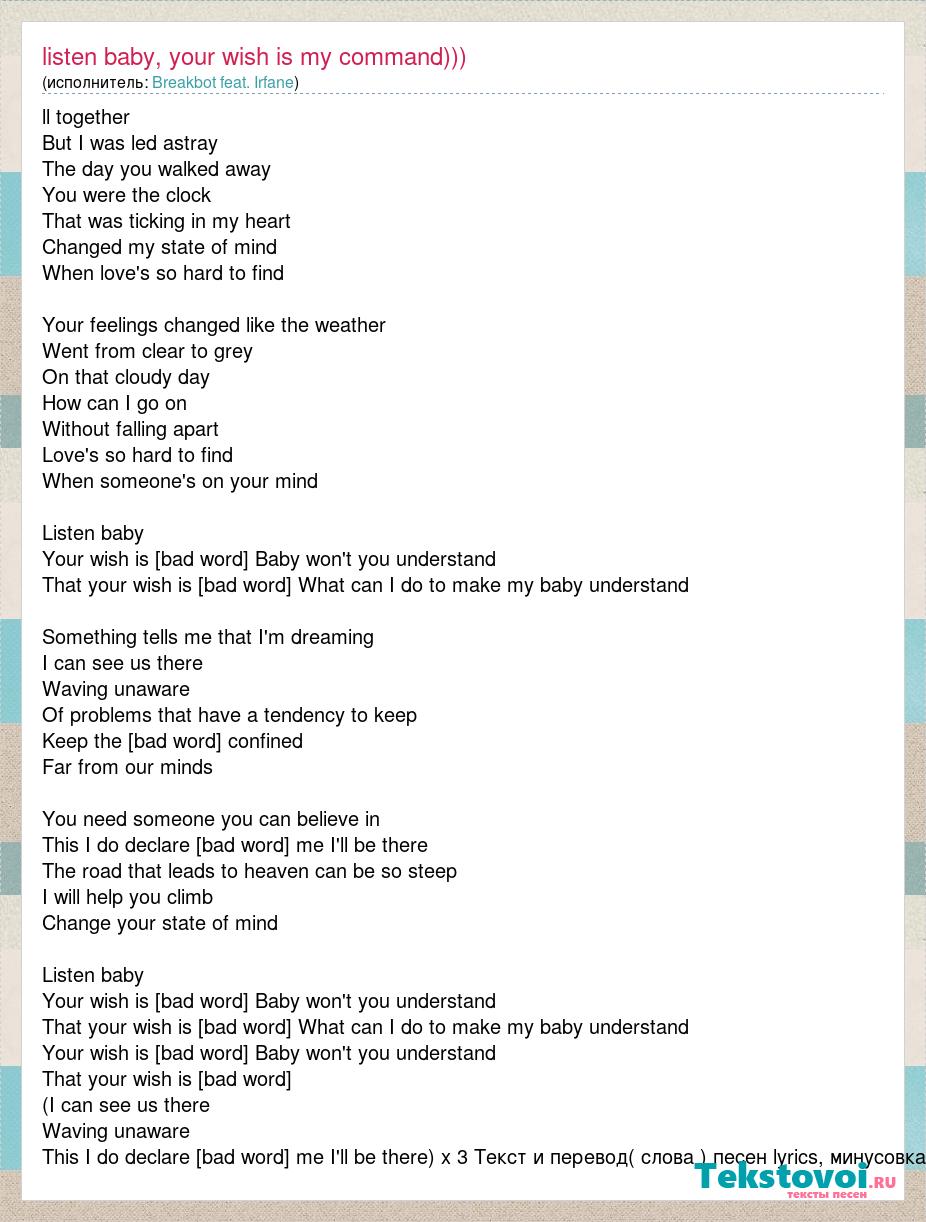 ll together But I was led astray The day you walked away You were the clock That was ticking in my heart Changed my state of mind When love's so hard to find Your feelings changed like the weather Went from clear to grey On that cloudy day How can I go on Without falling apart Love's so hard to find When someone's on your mind Listen baby Your wish is my command Baby won't you understand That your wish is my command What can I do to make my baby understand Something tells me that I'm dreaming I can see us there Waving unaware Of problems that have a tendency to keep Keep the truth confined Far from our minds You need someone you can believe in This I do declare Trust me I'll be there The road that leads to heaven can be so steep I will help you climb Change your state of mind Listen baby Your wish is my command Baby won't you understand That your wish is my command What can I do to make my baby understand Your wish is my command Baby won't you understand That your wish is my command (I can see us there Waving unaware This I do declare Trust me I'll be there) x 3 Текст и перевод( слова ) песен lyrics, минусовка