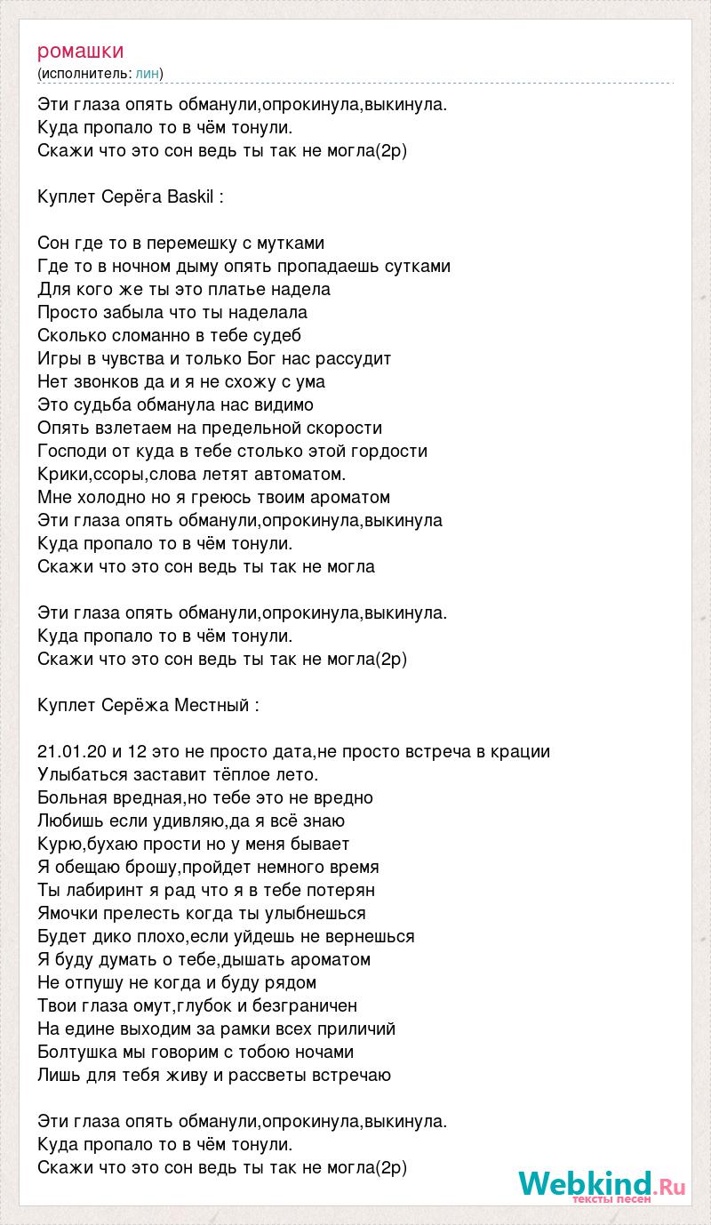 Эти глаза опять обманули,опрокинула,выкинула. Куда пропало то в чём тонули. Скажи что это сон ведь ты так не могла(2р) Куплет Серёга Baskil : Сон где то в перемешку с мутками Где то в ночном дыму опять пропадаешь сутками Для кого же ты это платье надела Просто забыла что ты наделала Сколько сломанно в тебе судеб Игры в чувства и только Бог нас рассудит Нет звонков да и я не схожу с ума Это судьба обманула нас видимо Опять взлетаем на предельной скорости Господи от куда в тебе столько этой гордости Крики,ссоры,слова летят автоматом. Мне холодно но я греюсь твоим ароматом Эти глаза опять обманули,опрокинула,выкинула Куда пропало то в чём тонули. Скажи что это сон ведь ты так не могла Эти глаза опять обманули,опрокинула,выкинула. Куда пропало то в чём тонули. Скажи что это сон ведь ты так не могла(2р) Куплет Серёжа Местный : 21.01.20 и 12 это не просто дата,не просто встреча в крации Улыбаться заставит тёплое лето. Больная вредная,но тебе это не вредно Любишь если удивляю,да я всё знаю Курю,бухаю прости но у меня бывает Я обещаю брошу,пройдет немного время Ты лабиринт я рад что я в тебе потерян Ямочки прелесть когда ты улыбнешься Будет дико плохо,если уйдешь не вернешься Я буду думать о тебе,дышать ароматом Не отпушу не когда и буду рядом Твои глаза омут,глубок и безграничен На едине выходим за рамки всех приличий Болтушка мы говорим с тобою ночами Лишь для тебя живу и рассветы встречаю Эти глаза опять обманули,опрокинула,выкинула. Куда пропало то в чём тонули. Скажи что это сон ведь ты так не могла(2р)