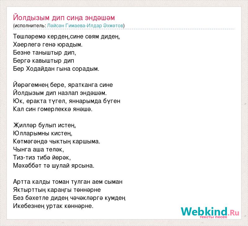 Төшләремә кердең,сине сөям дидең, Хәерлегә генә юрадым. Безне таныштыр дип, Бергә кавыштыр дип Бер Ходайдан гына сорадым. Йөрәгемнең бере, яратканга сине Йолдызым дип назлап эндәшәм. Юк, еракта түгел, яннарымда бүген Кал син гомерлеккә янәшә. Җилләр булып истең, Юлларымны кистең, Көтмәгәндә чыктың каршыма. Чынга аша теләк, Тиз-тиз тибә йөрәк, Мәхәббәт тә шулай ярсына. Артта калды томан тулган аем сыман Яктырттың караңгы төннәрне Без бәхетле дидең чәчәкләргә кумдең Икебезнең уртак көннәрне.
